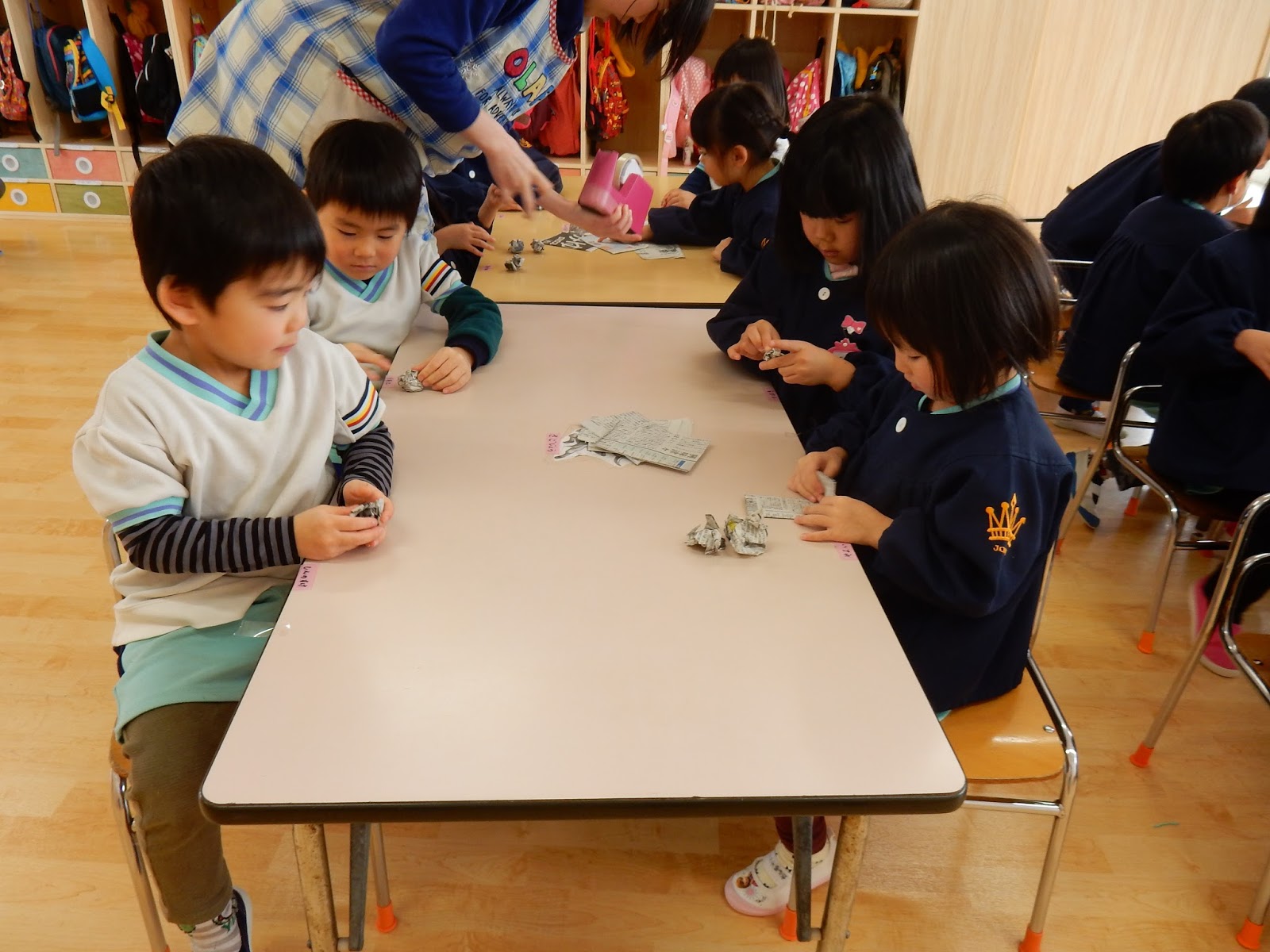 ゆりさんでも、準備&練習!みんなで新聞ボールをたくさん作って、明日に備えます。上手に小さく丸めて、テープでとめていきます。たくさん集まったボールをポケットにたくさん詰め込んで…あい先生鬼目がけて『えい!!!』