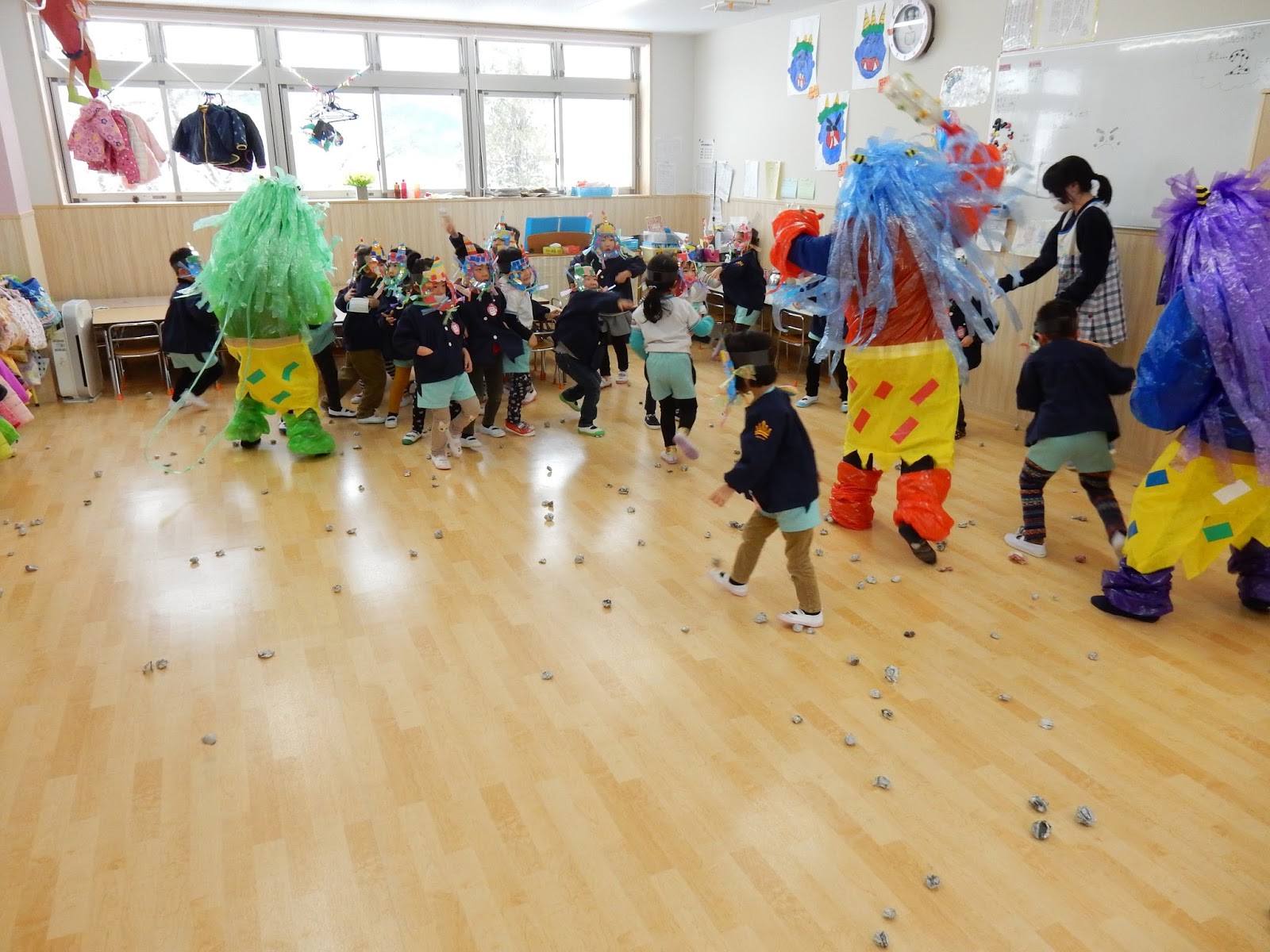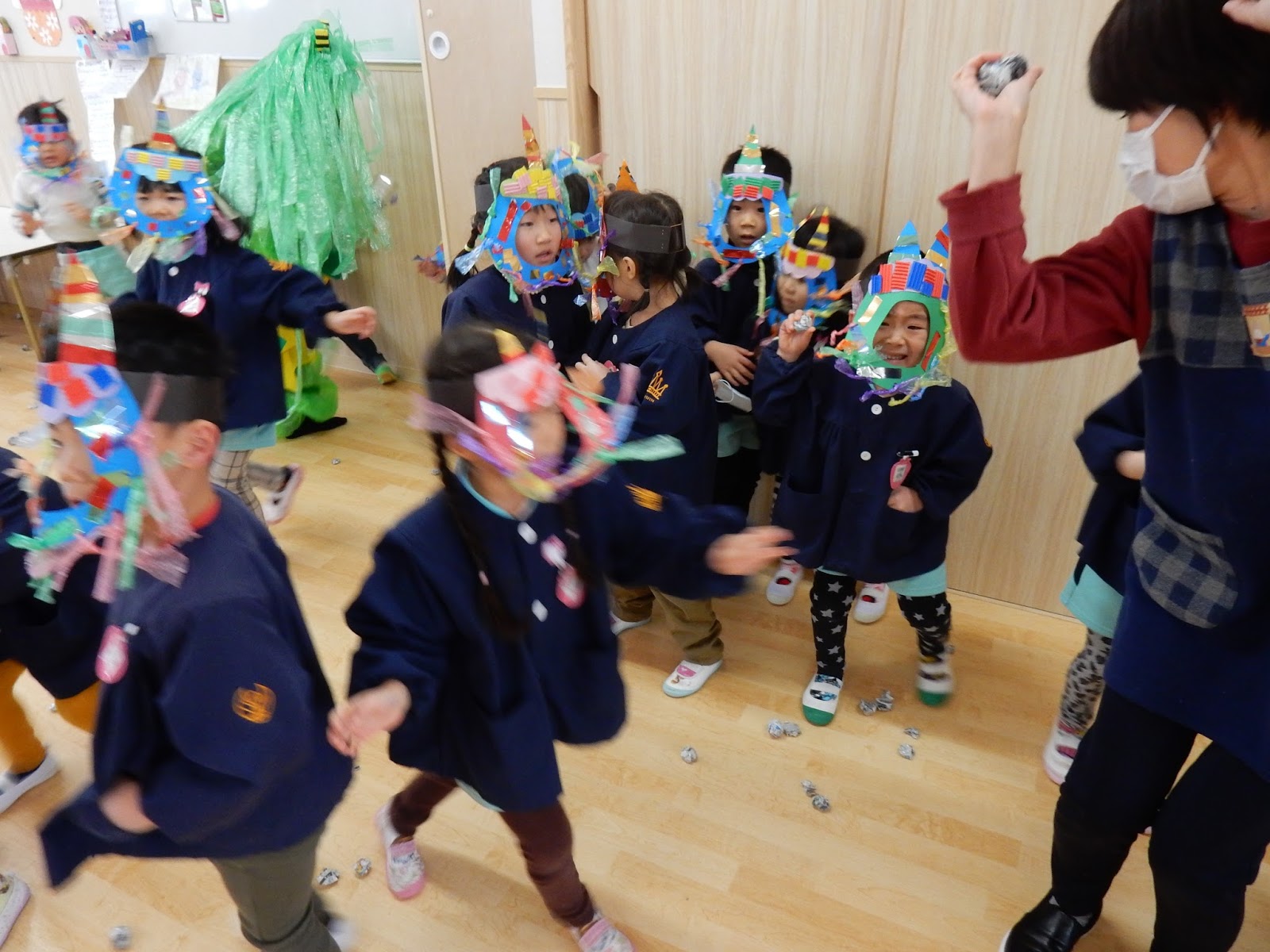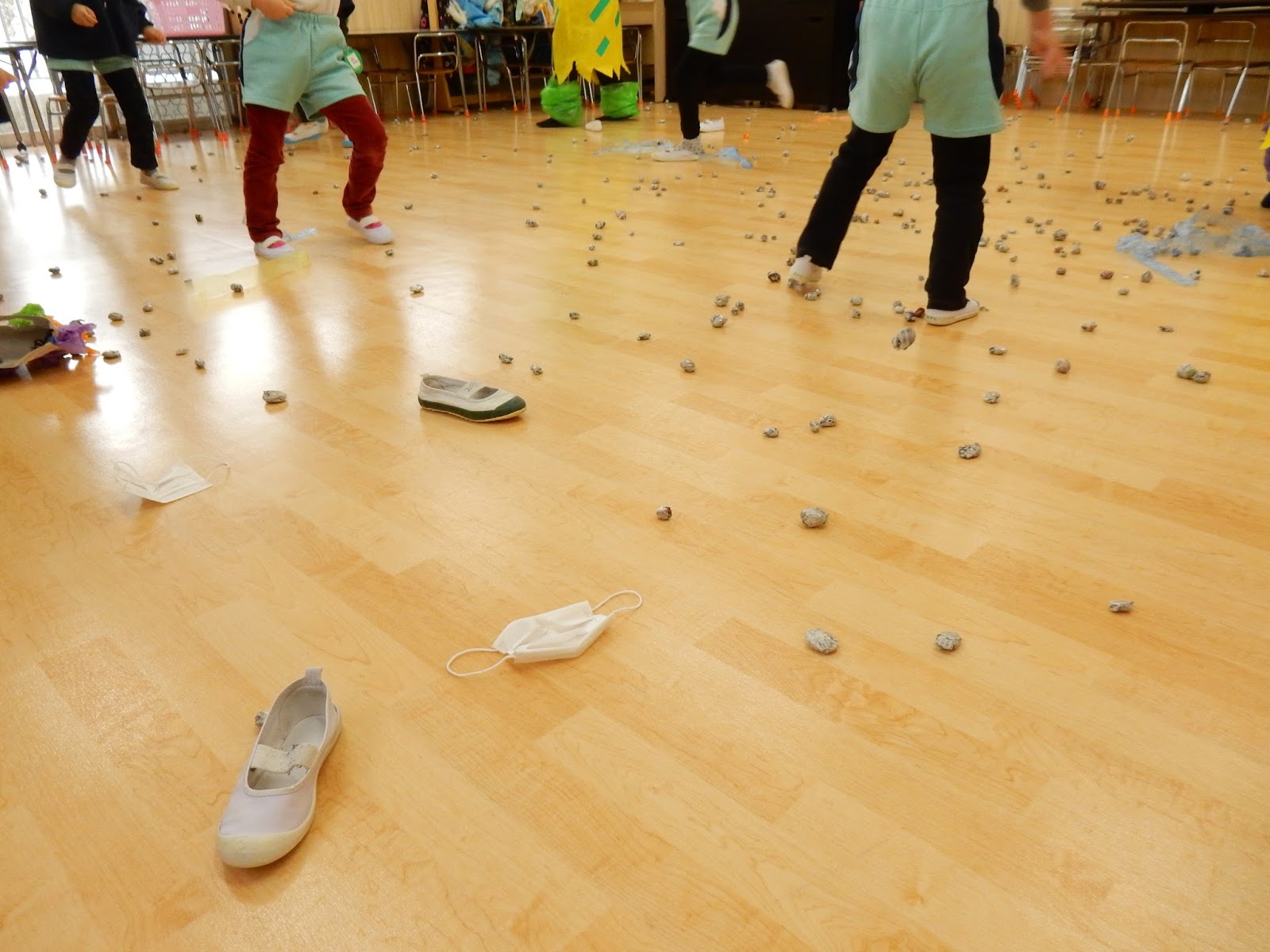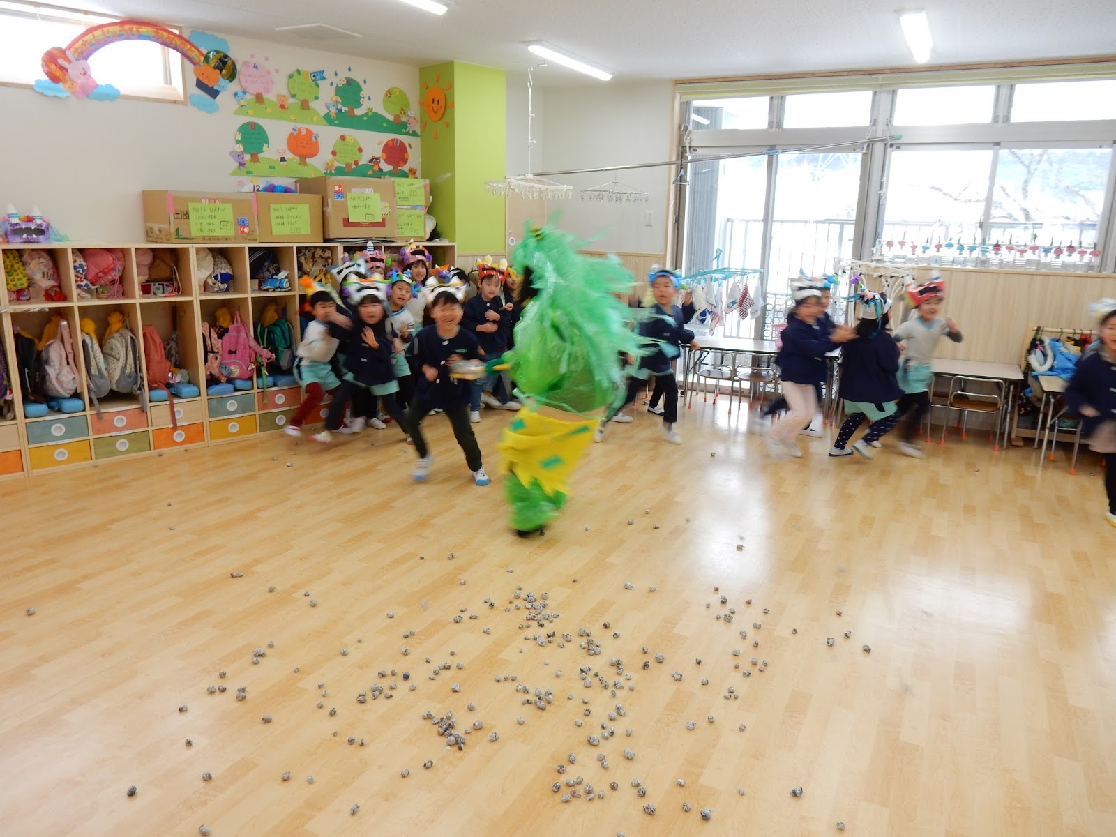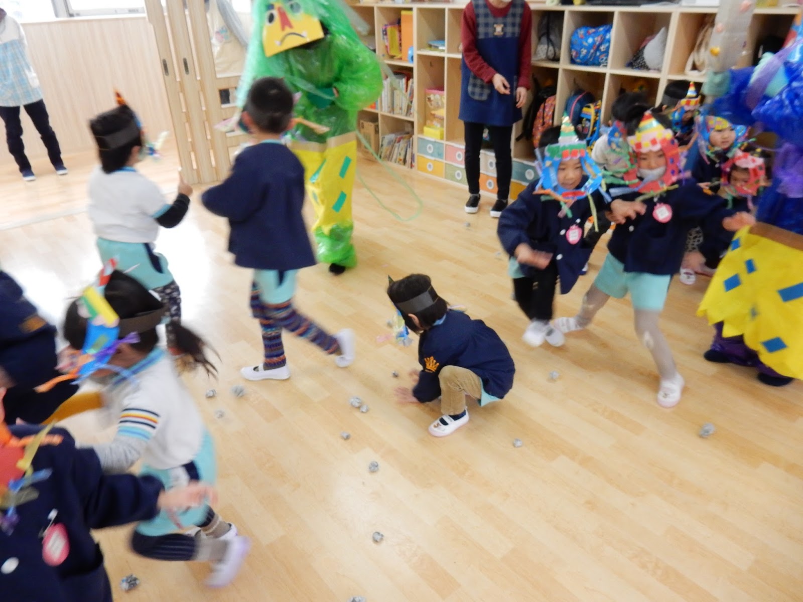 そして!!最後はひまわりさん!バッチリ鬼をやっつけてくれました!!!…と言いたいところですが…(笑)ひまわりさんも、怖いものは、怖いんです!というか、毎年経験してきたことや、鬼=怖いというイメージがしっかりできあがっているひまわりさんの方が、実は怖さを知っているんですよね。なので、写真の通り。とにかく逃げる!!!!まずは逃げる!!!!!海の中を泳ぐ小魚の群れのように、みんなでお部屋をグルグル。去った後には上靴やマスクが落ちていて、みんなの必死さが伝わってきました。それでも慣れてくると、散らばった豆を拾って投げているお友達もいましたよ!園生活最後の豆まき。お家で感想を聞いてみて下さいね!