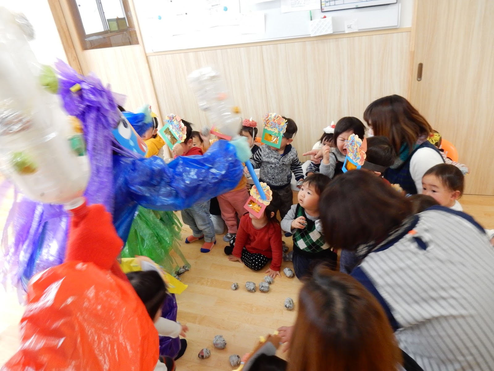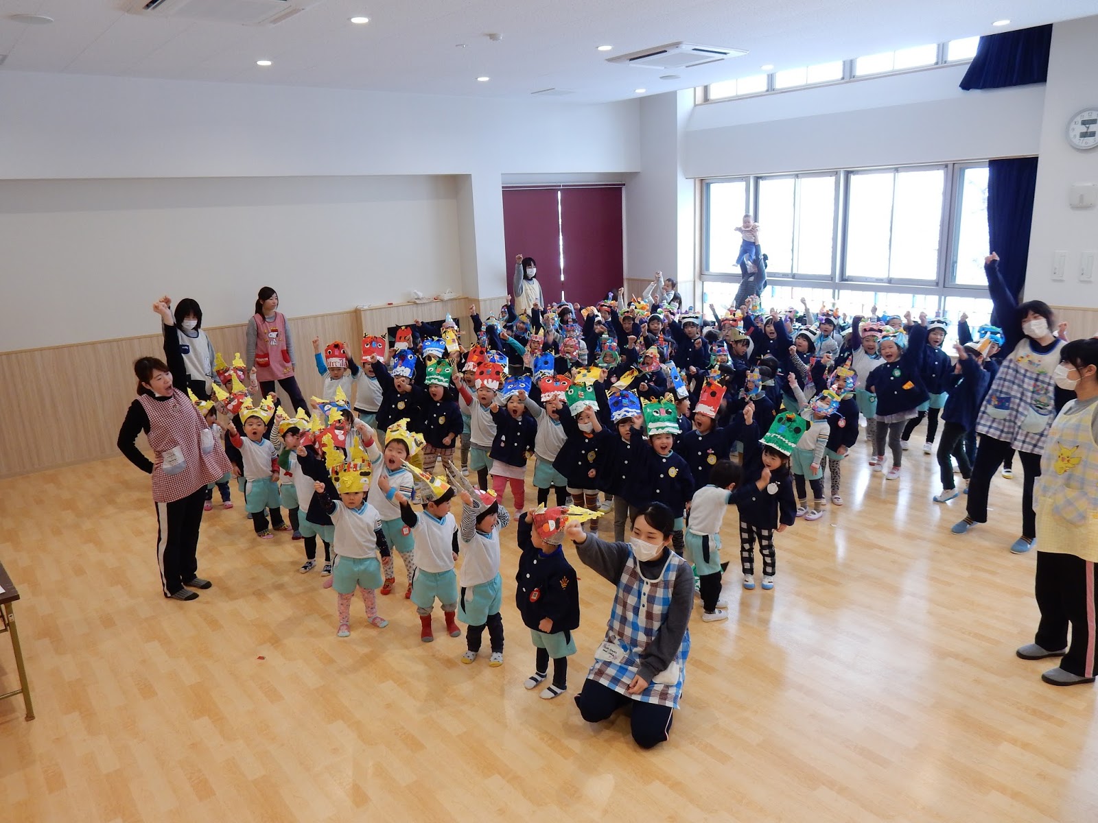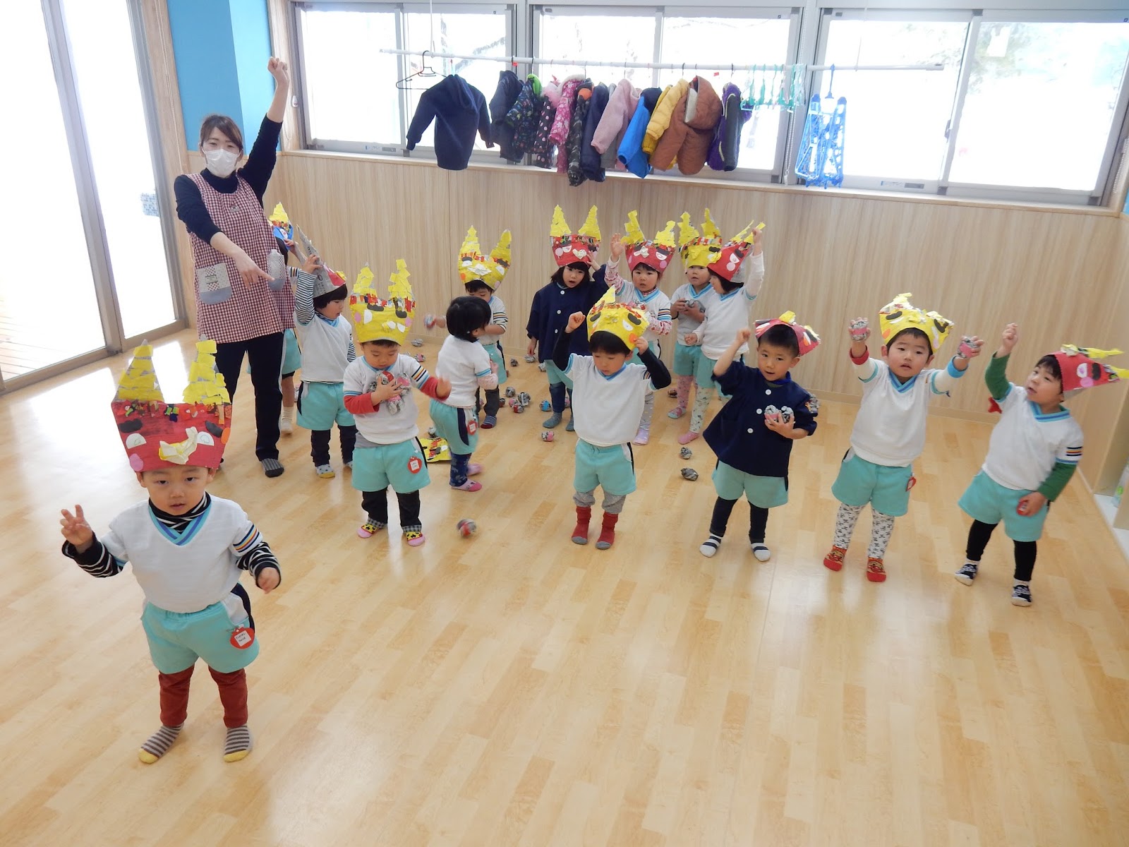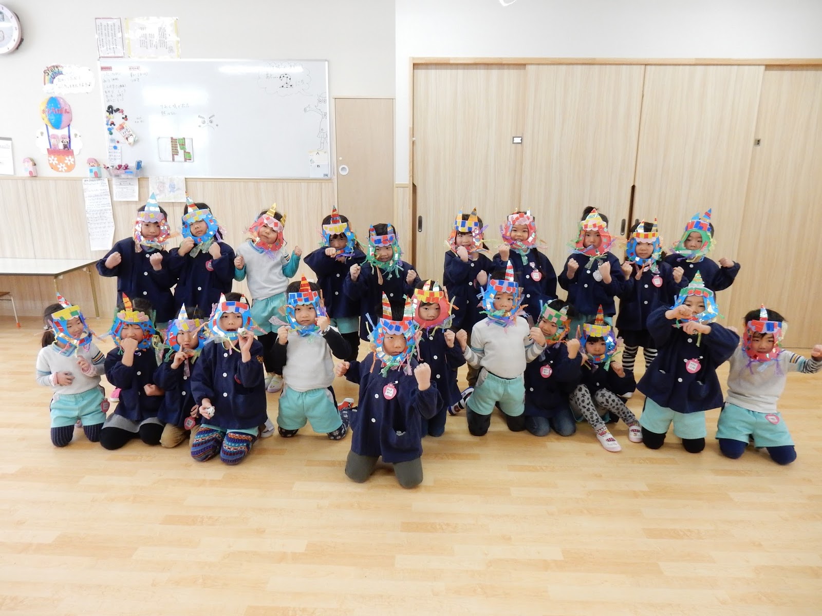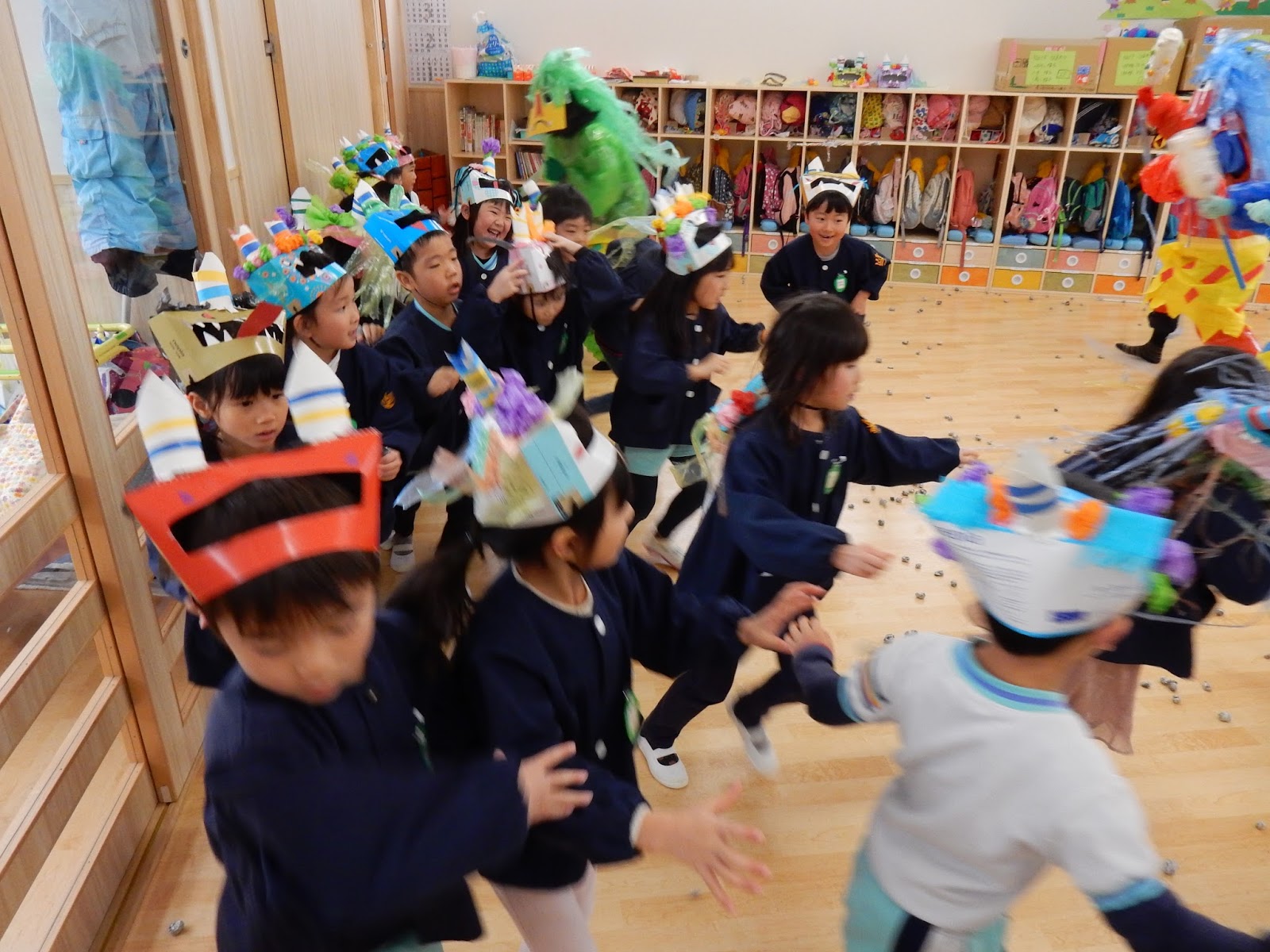 そして!!最後はひまわりさん!バッチリ鬼をやっつけてくれました!!!…と言いたいところですが…(笑)ひまわりさんも、怖いものは、怖いんです!というか、毎年経験してきたことや、鬼=怖いというイメージがしっかりできあがっているひまわりさんの方が、実は怖さを知っているんですよね。なので、写真の通り。とにかく逃げる!!!!まずは逃げる!!!!!海の中を泳ぐ小魚の群れのように、みんなでお部屋をグルグル。去った後には上靴やマスクが落ちていて、みんなの必死さが伝わってきました。それでも慣れてくると、散らばった豆を拾って投げているお友達もいましたよ!園生活最後の豆まき。お家で感想を聞いてみて下さいね!