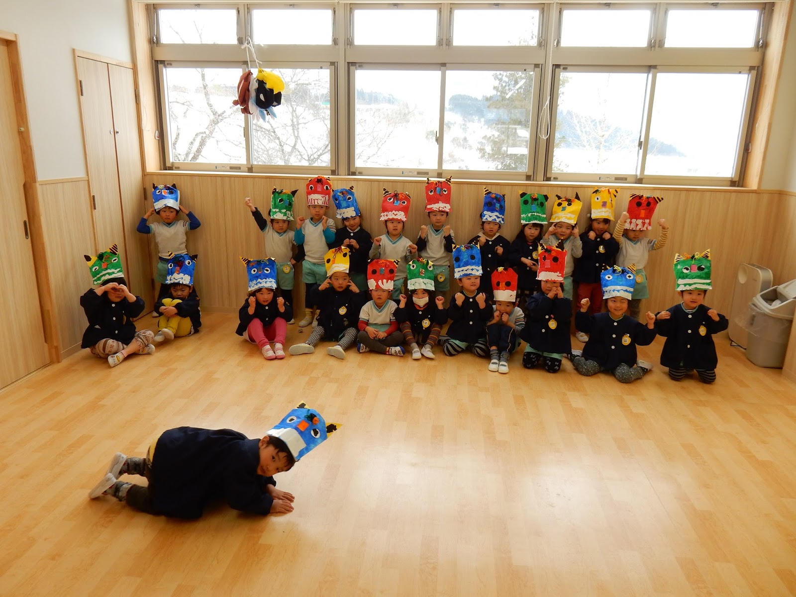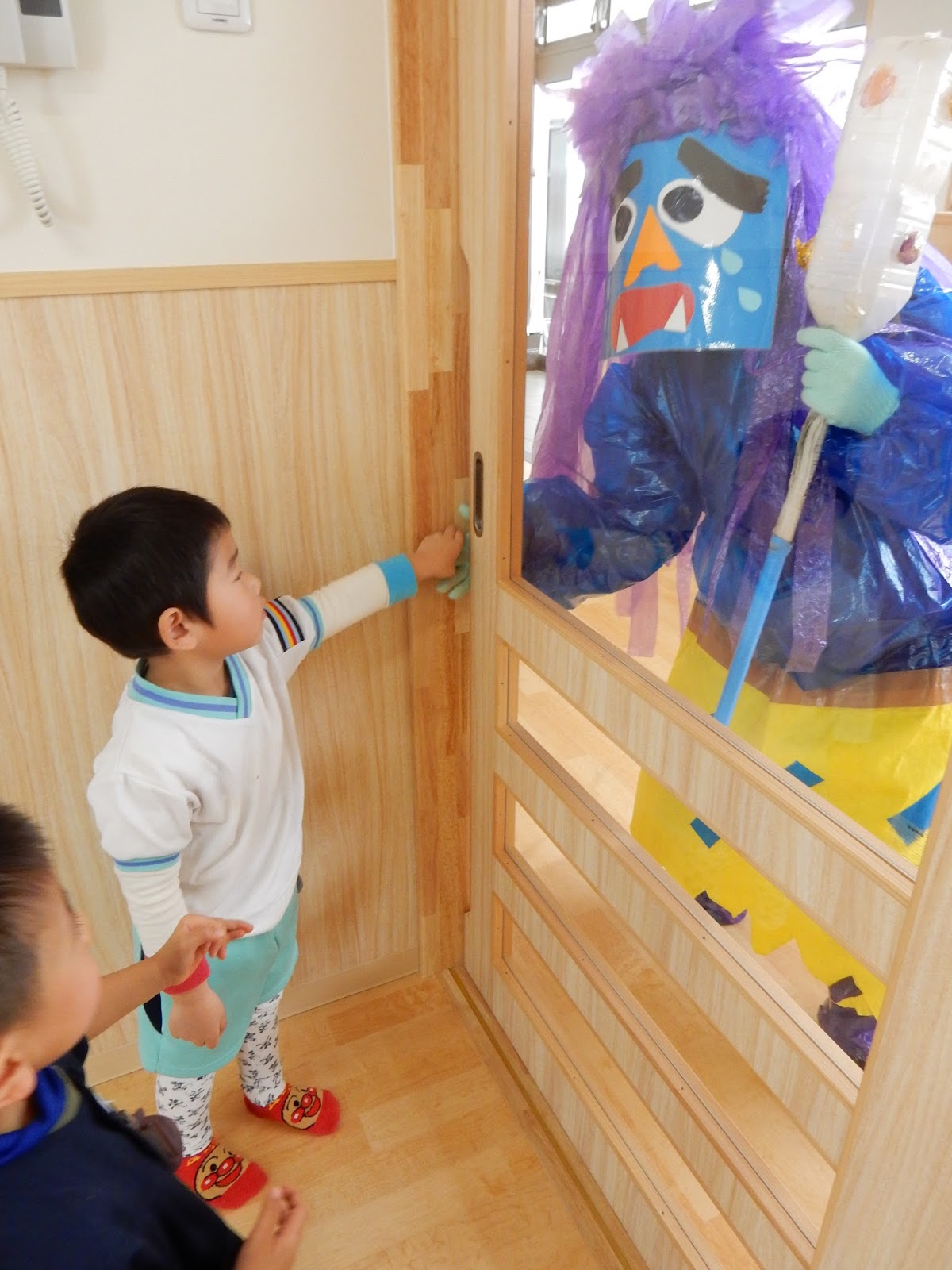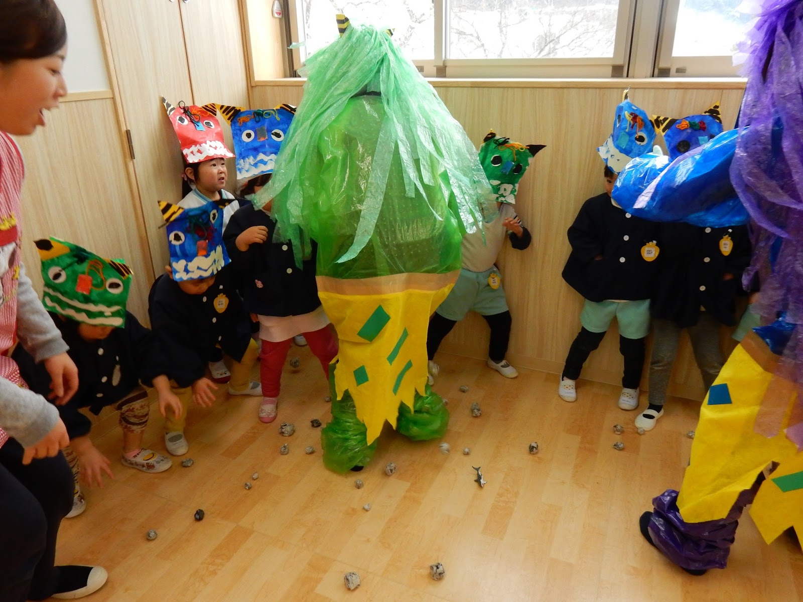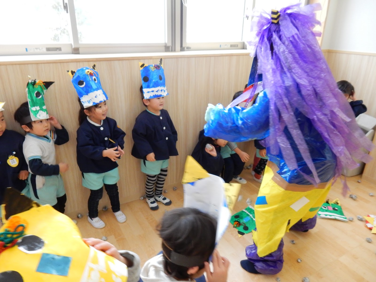 『鬼さんから守ってあげる!』 『先生、僕の後ろにかくれてもいいよ!』 『豆、沢山ポケットに入れたよ!』と準備万端整ったところに、鬼登場!!!!さて、どうなったのでしょうか!?