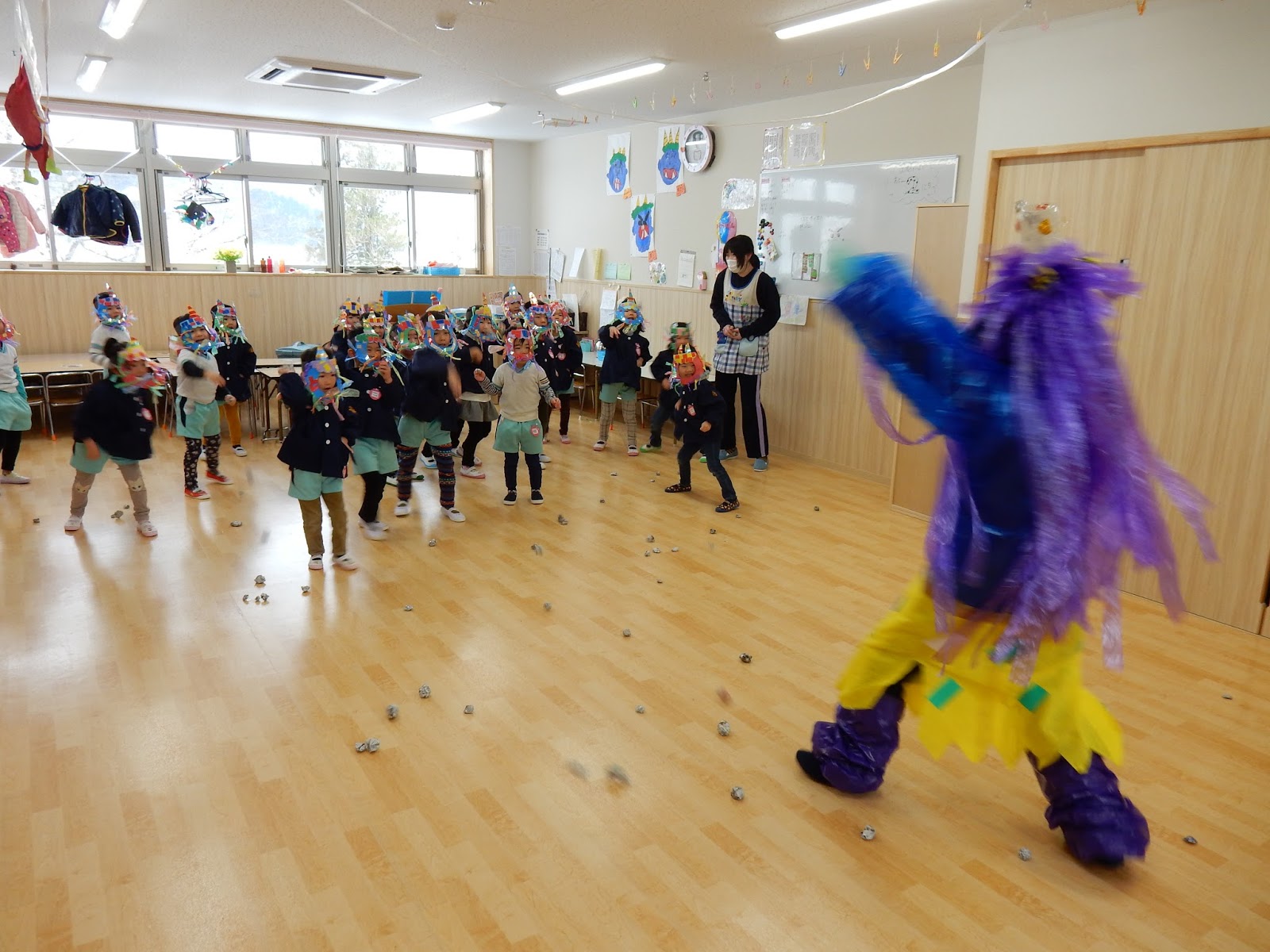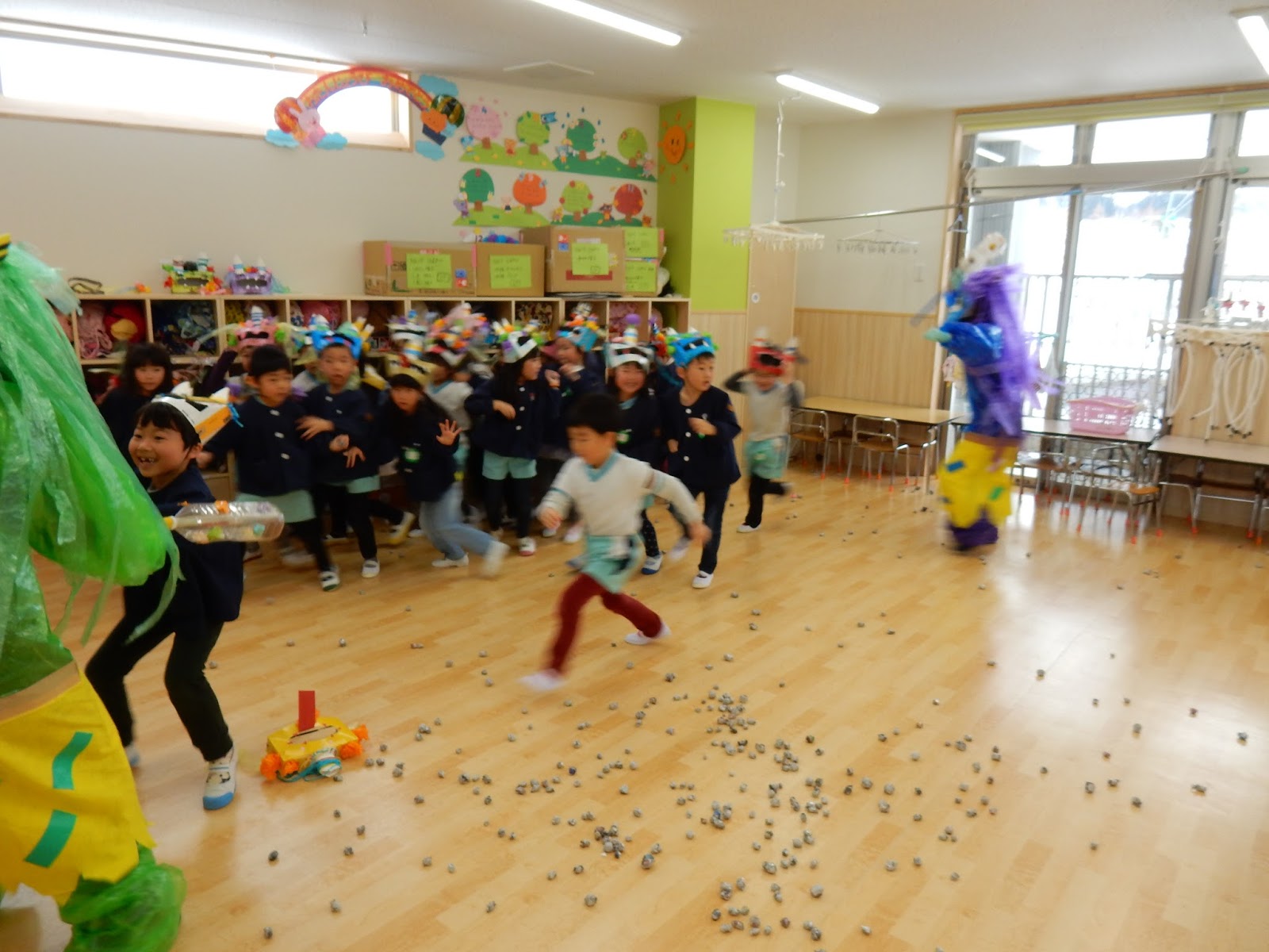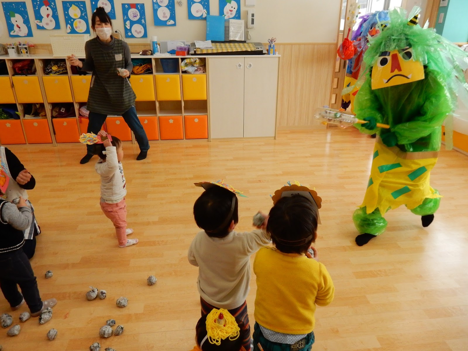 こちらはゆりさん!昨年大泣きしていたお友達(特に女の子)が強くなっていたことに感動!!!顔が引きつりながらも一生懸命鬼さんに向かって豆を投げていました!怖さを吹き飛ばし、がんばることができたみんな。きっと、自信がついたでしょうね!しかし!やっぱり怖かったみたいで、途中で鬼さんにさらわれてしまった愛先生と、みずき先生を助けに駆け寄ることはできませんでした(笑)その代わりに、大きな声で威嚇しながら(本当はみんな必死過ぎてなんて言ってるのかわからなかったんです)豆をまいてくれたので、大好きな先生たちは帰ってきてくれましたよ♪