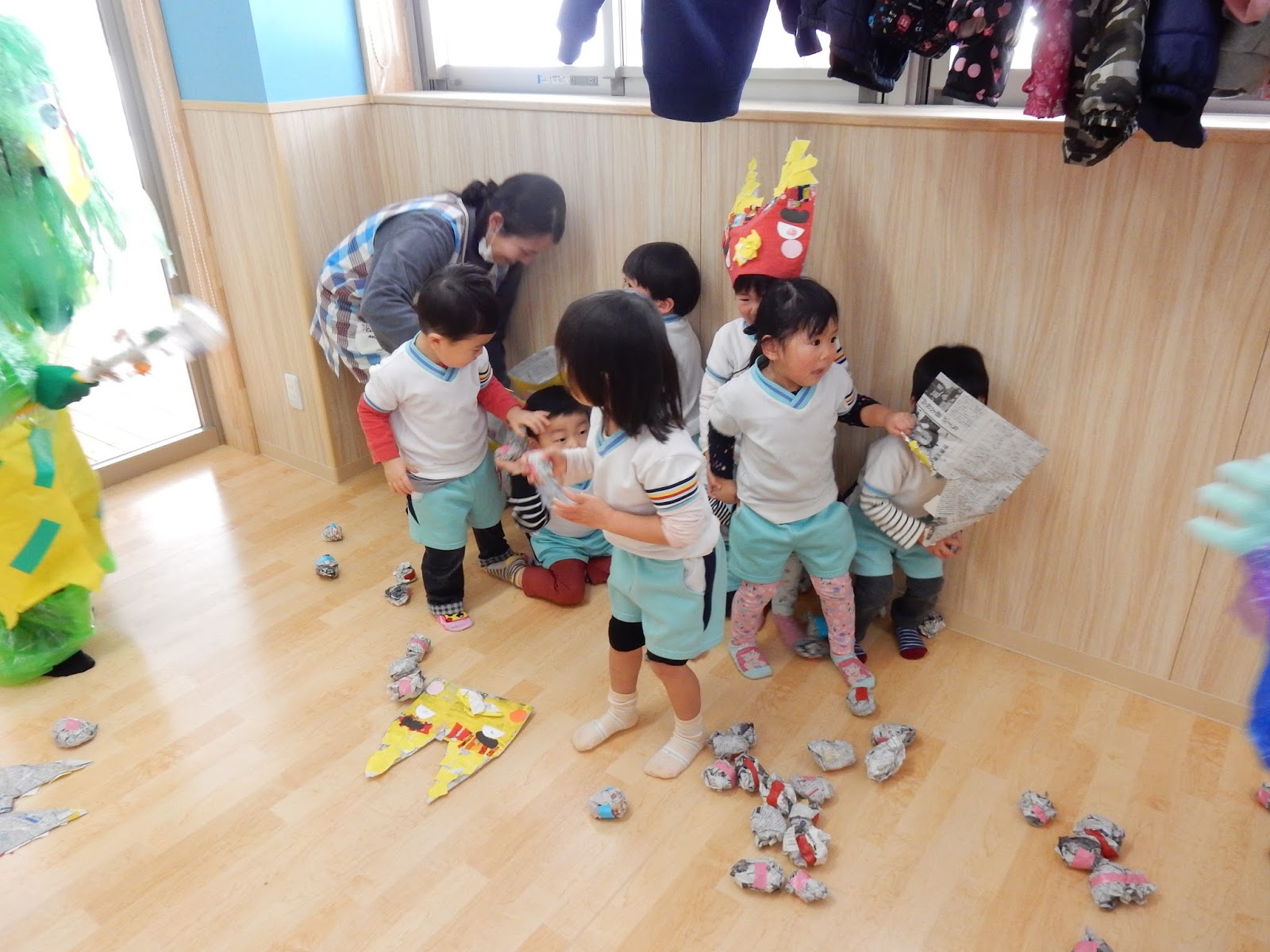 こちらはひよこさんのお部屋。3人の鬼さんの登場にビックリして涙の出る子もいましたが、練習の成果が出たのでしょうか!想像以上に豆ひろって鬼さんに当てようと奮闘する子が多かったように感じます!
