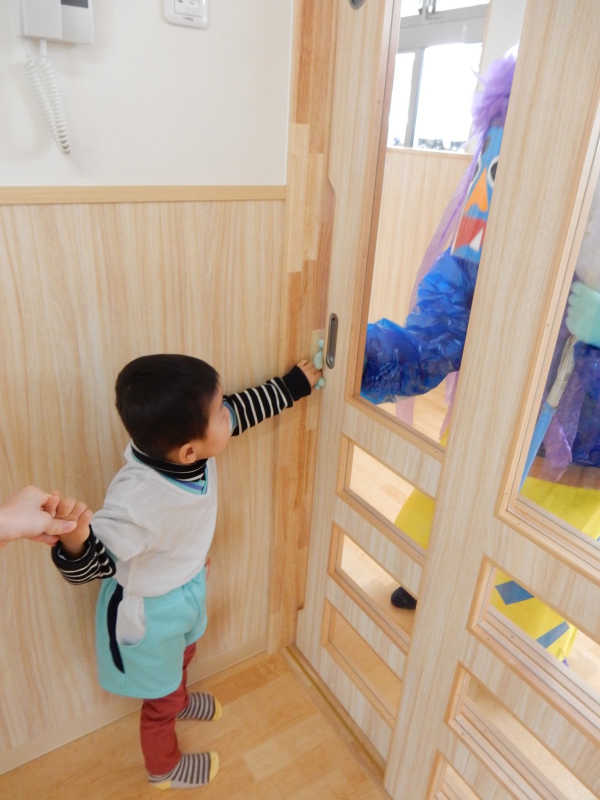 各クラスを回った後の鬼さんは、ちょうど子育てサークルを行っていたぴよぴよルームにも少しお邪魔してきたみたい。ここでも、親子(主にお母さん♡)で豆まきを楽しんでくれたみたいですよ♪