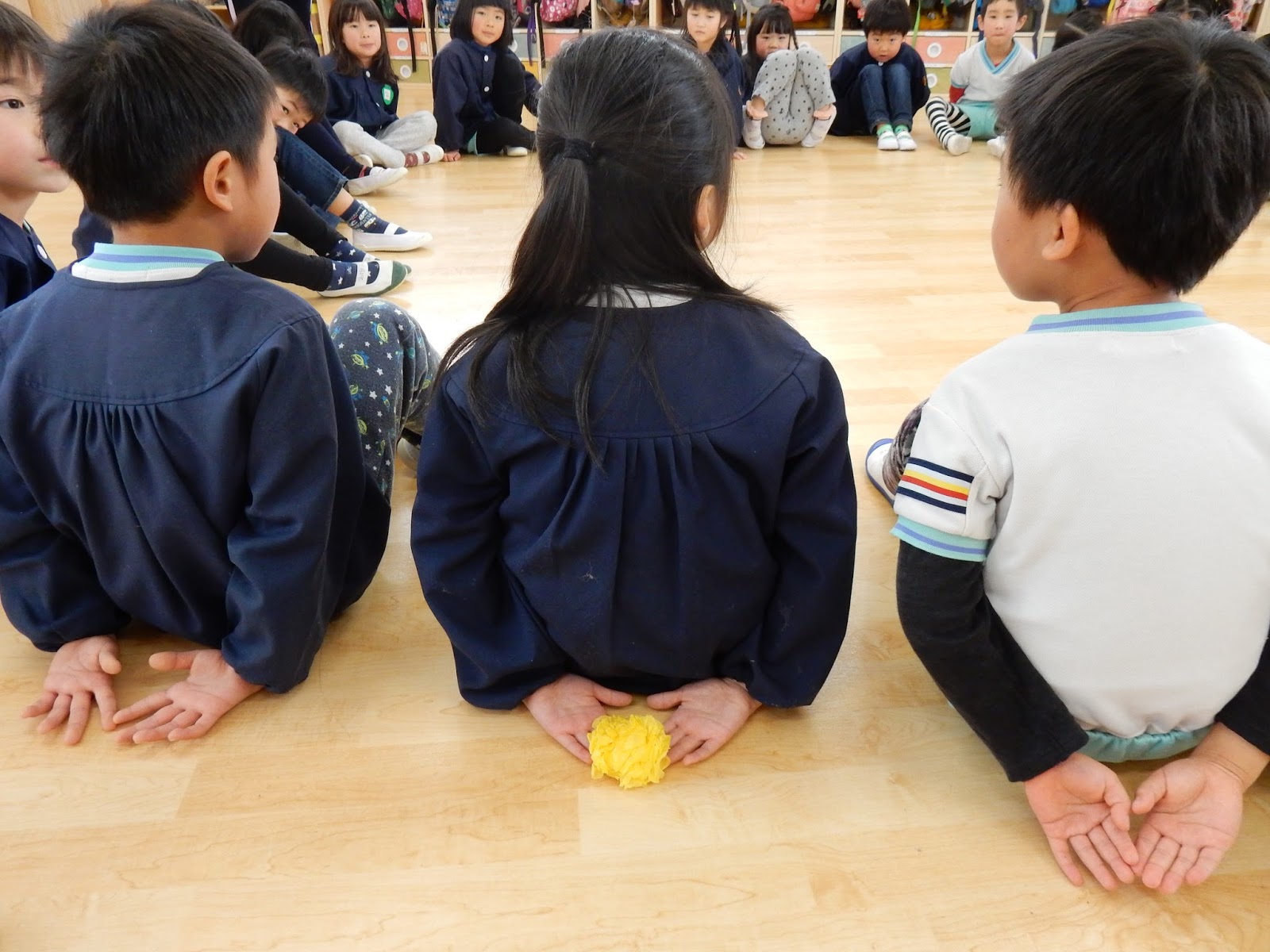 ひまわりさんは、お部屋でハンカチ落とし。お部屋の中なので、走らないように、早歩きで!という特別ルール!みんな手元に集中して、たのしんでいました。