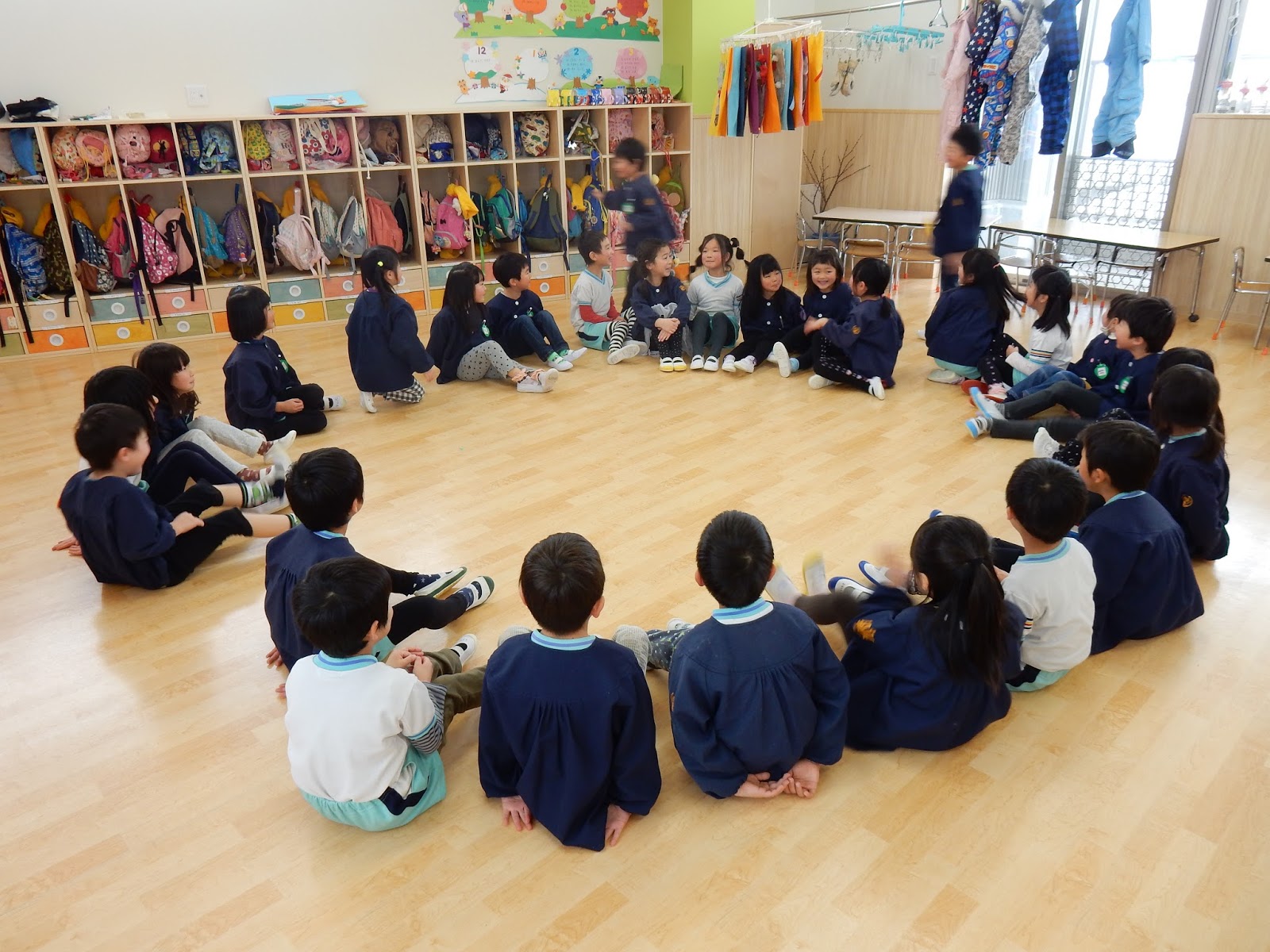 ピシっと伸びた背中。手はお膝に置いて、足は揃えて。とってもいい姿勢ですよね!子ども達にとっては、少し窮屈な時間かもしれませんが、こうして良い姿勢でお話を聞くという経験も、これから先子ども達に必要な時間ですよね。短い時間から始めて、無理なく集中して過ごす力を付けていきます。こうした時間があるからこそ、この後の遊びの時間がより充実した時間にもなります。