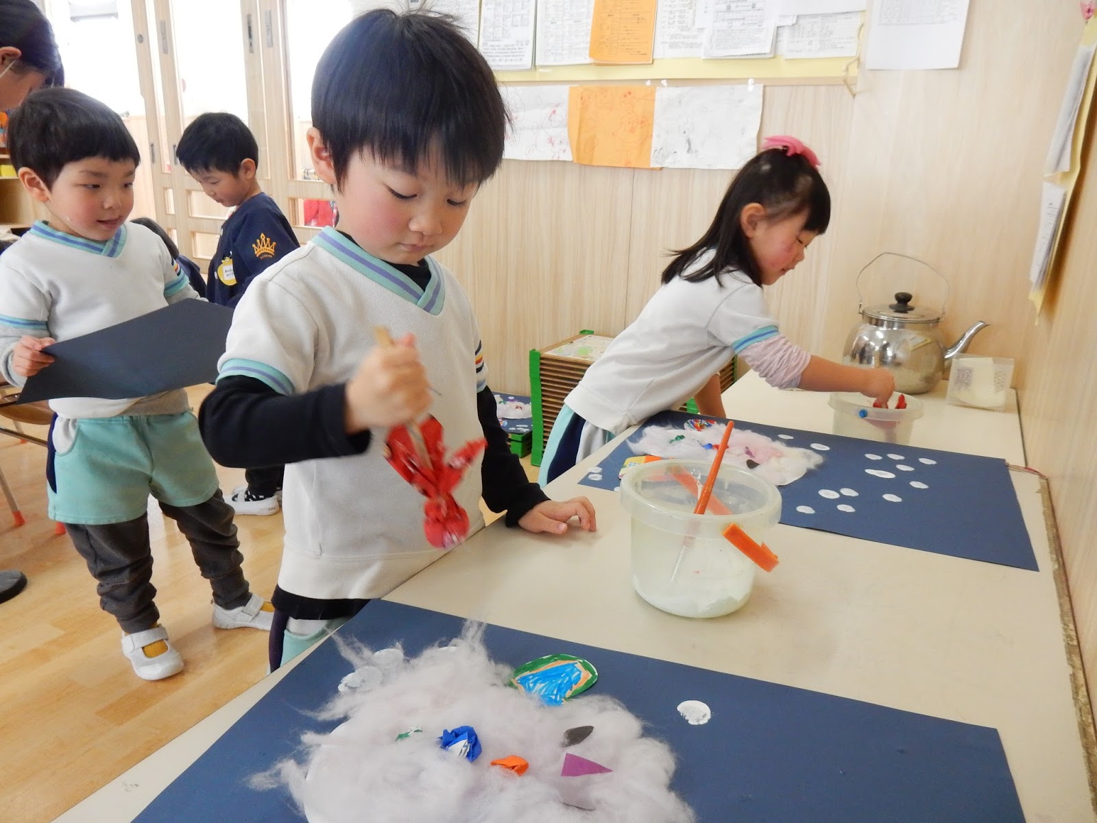 たんぽぽさんは、大きな画用紙に以前作った雪だるまを貼りつけて、そこにタンポで雪を降らせました。ぽんぽん♪とリズミカルにスタンプしていくと、外の景色と同じような雪化粧!雪だるまさんも嬉しそう♪
