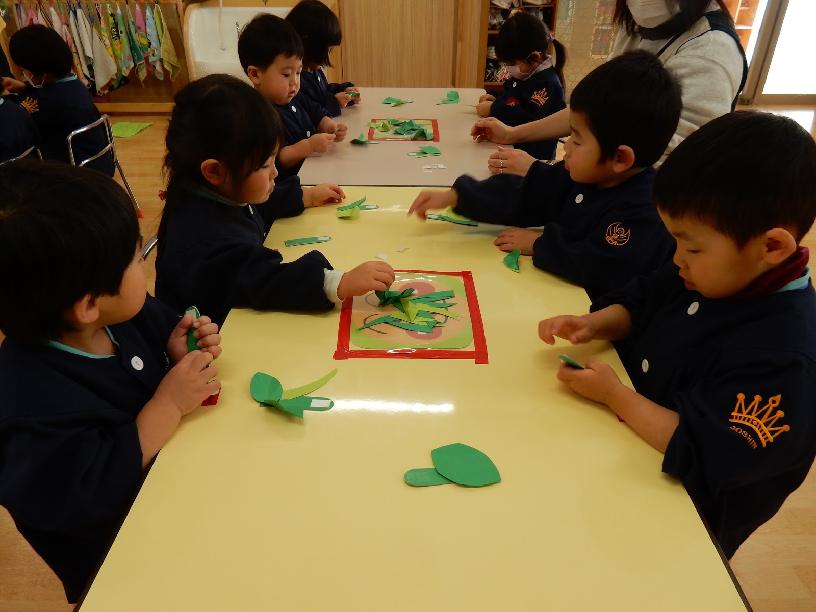 すみれさんは、両面テープをはがして製作。葉っぱや、お花紙を貼りつけて、かわいらしお花がたくさん咲きましたよ!この後このお花がどうなるのか…それはできてからのお楽しみです♪