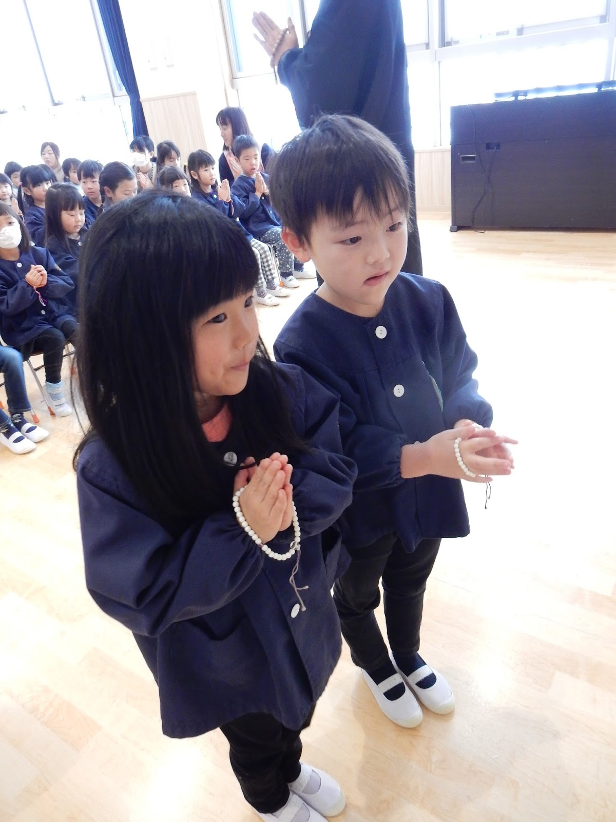 今日は初めてだったこともあり、園長先生の『きみょ~むりょ~…』という呪文のような言葉を真剣な表情で聞いていたり、後について真似してみたり、あくびをしてみたり…(笑)次回は、何か面白いビデオを見せてもらえるという事で楽しみにしています!