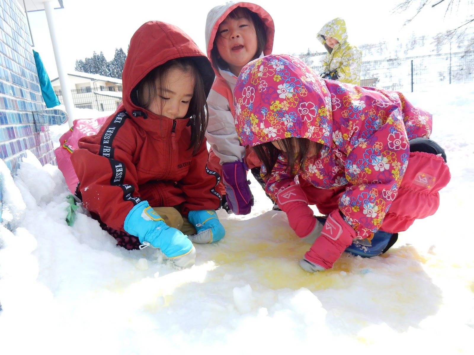 色つきの雪は遊びが広がります。固めたり、バケツに入れるのも、色がついているといつも以上に楽しく、会話も弾みます。スイカ味、メロン味…いろんな味のご飯が完成したようですよ!