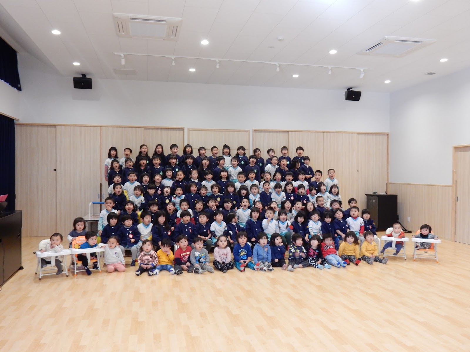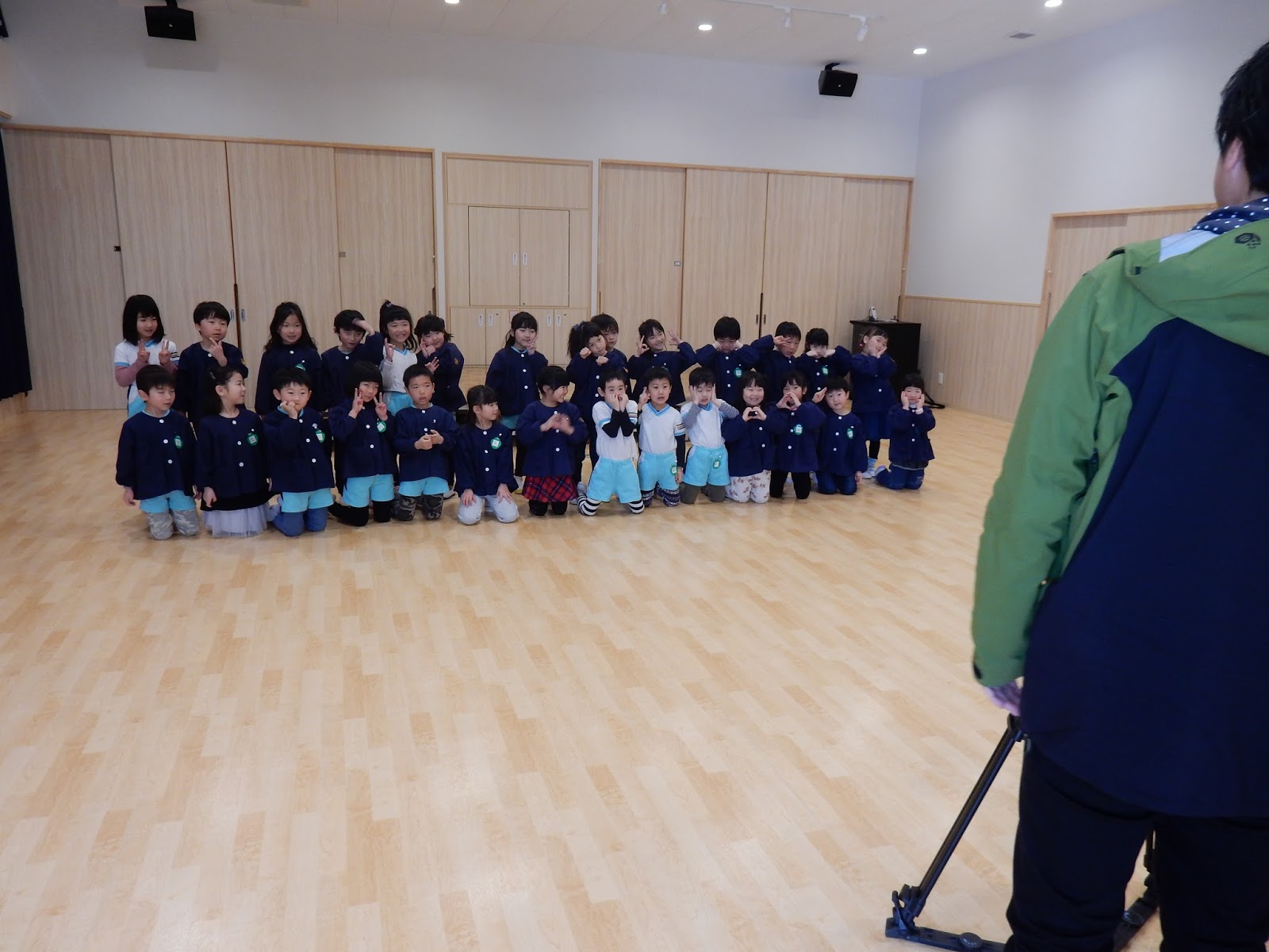 今朝はみんながホールに集合!こうやって並んでみると、お友達の多さにビックリ!ステージの上には長椅子や、机を組み合わせて雛壇を作りました。今日は、ケーブルテレビ、“ちびっこあつまれ”の撮影日。皆さんのご家庭でも1度は見たことがあるのではないでしょうか。市内の保育園や幼稚園を順に回られているそうですが、今年度は、浄心こどもの城が最後だそうです!