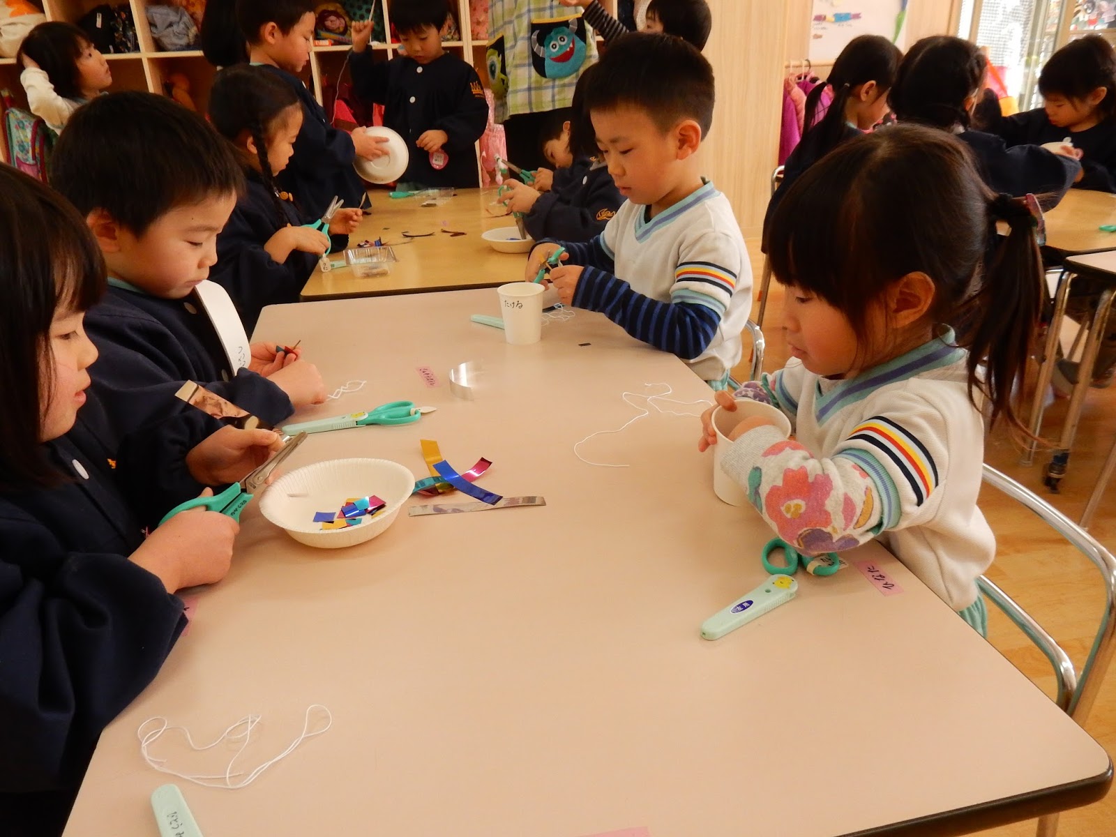 ゆりさんは、キラキラのテープを細かく切って、そこに水を貼り、氷実験の下準備。容器も、水の量も一人ひとり違います。どれくらい入れたら凍るかな??と考えながら準備をしたものを2階のベランダに並べました。休み明け、どうなっているかな???楽しみですね!