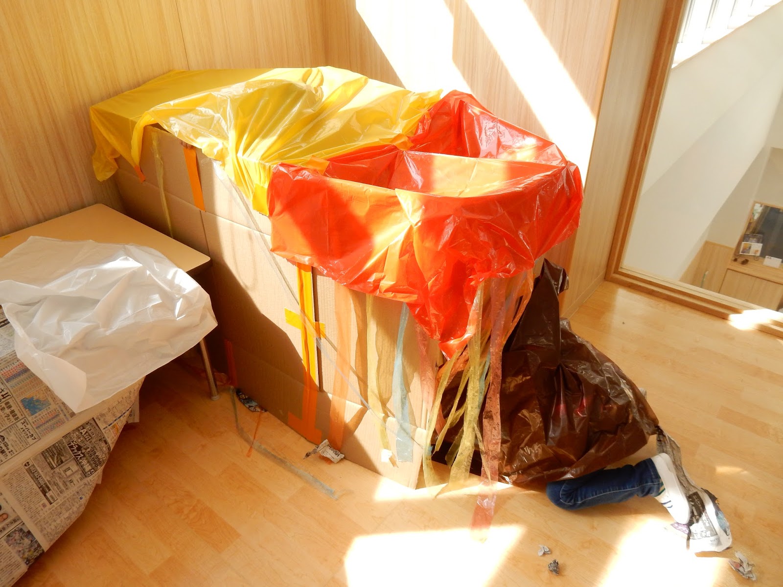 小さいクラスの様子を見た後に2階へ行ってみると、クラスによって遊び方は様々!ひまわりさんは、椅子や机も組み合わせて大掛かりな、まさに基地!といった出来栄え。加えて、ダンボールで作った小さいかわいらしいお家が何軒かできていました。