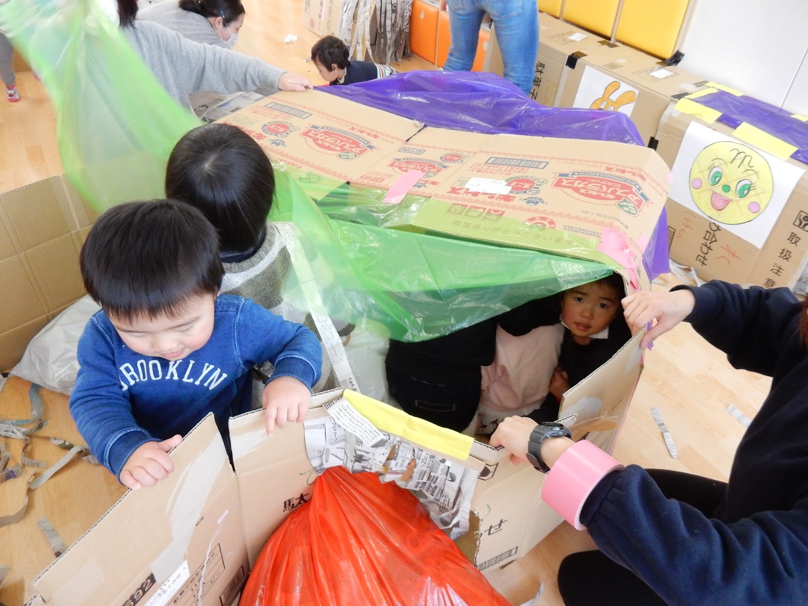 もぞもぞ動くダンボールのお家…のぞいてみるとお友達がたくさん!(笑)ここでもぎゅうぎゅうです!!トンネルにはギザギザをたくさんつけたの!と教えてくれたり、お友達の作ったトンネルを『たのしい!!』と言いながら何度も通ったり。子ども達の満足そうな笑顔がたくさん見えました!
