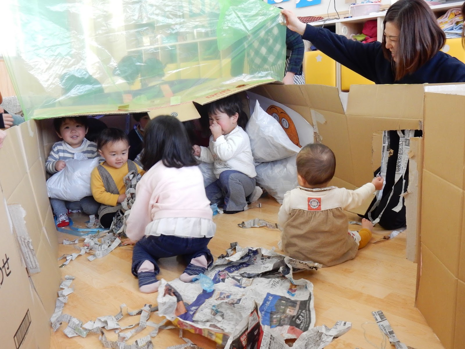 午前中にクラスごとで作った基地は、午後から3クラスで交流をして、いろんな所へ遊びに行ってきました。大きい子も、小さい子も、それぞれが作った基地を楽しみ、そして『かわいくできたね!』 『すご~い!!』とお互いを認め合い、またこんな風に作ったんだよ!と教えてあげたりと、たくさん遊ぶ事が出来ました。2月のわいわいデーも大成功でしたよ♪