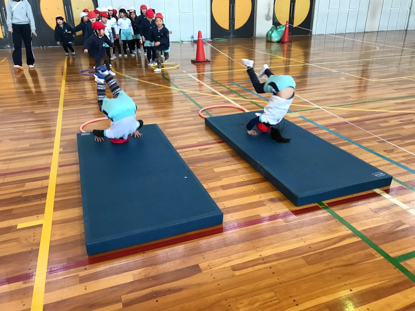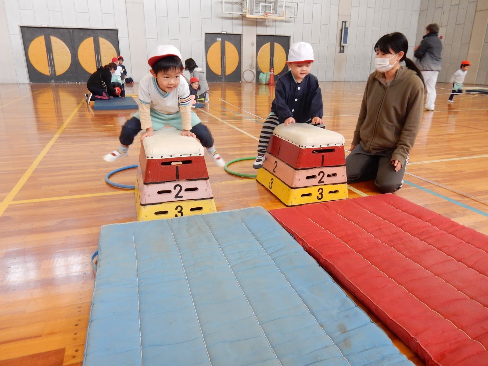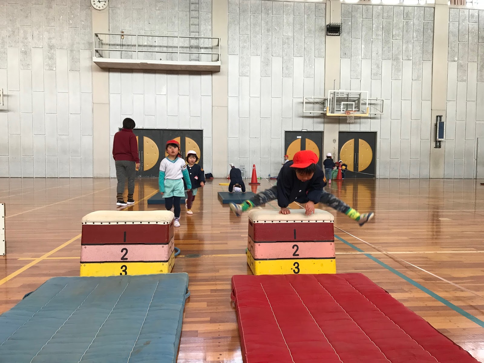 全身運動で体を温めた後は、サーキットも頑張りました!初めは体が硬かった子も、何州化するうちに跳び箱も気持ちよく飛び越せ、逆上がりや、前まわりも、回を重ねるごとに上手くなっていきます。終了の合図がかかるまで、どのクラスの子もほっぺたを真っ赤にしながら一生懸命走り、何周も、何周もまわり続けました!