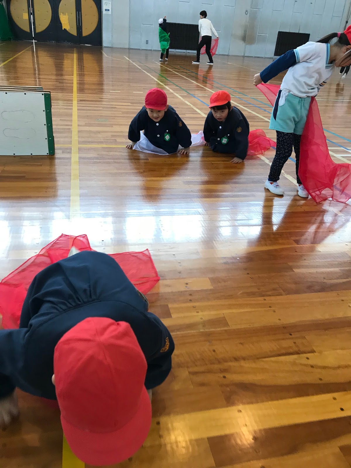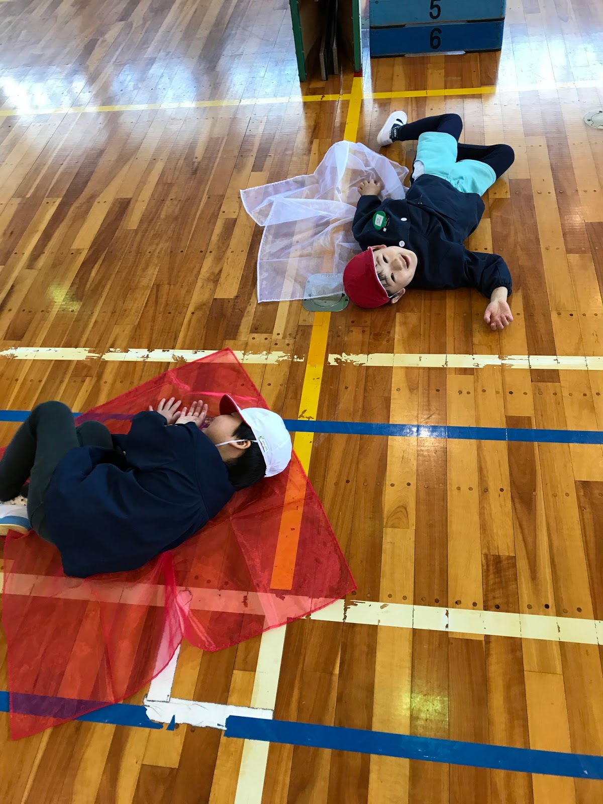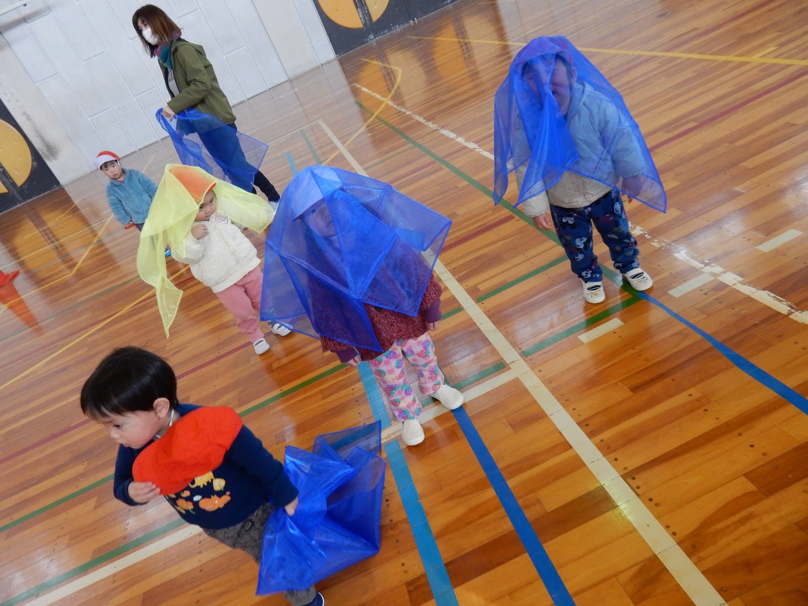 newアイテムは、風呂敷のような布。マントにしたり、下に敷いたり、ドレスにしたり、子ども達もいろいろ考えます。顔にくっつけて、それが落ちないようにひたすら走ってみたり、闘牛ごっこが始まったり。同じアイテムも、年齢によって活用に仕方は様々。とても軽いので、腕をしっかり振って回したり、投げてみたりすれば立派な運動に!!