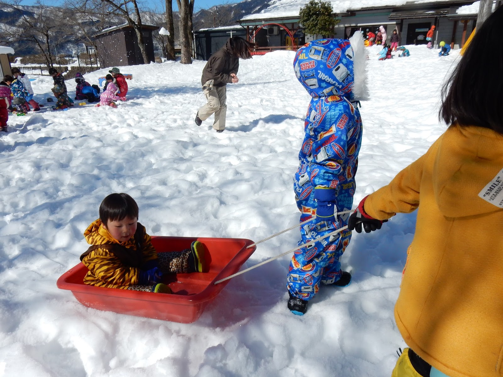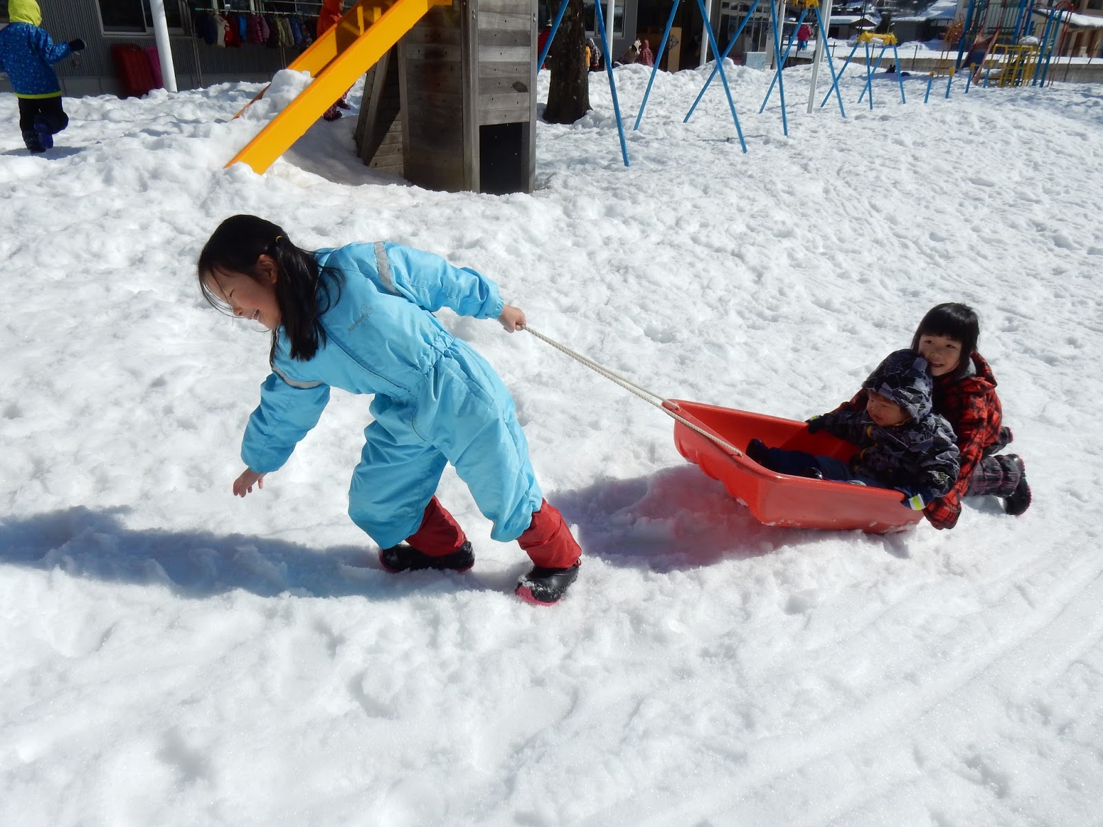 勢いよくソリですべたり、小さいお友達を乗せて歩いたり、そりの数は十分ではありませんが、みんな上手に順番に滑ったり、貸し借りができるんです♪遊びを通して、こういった社会性も見について行きますね!