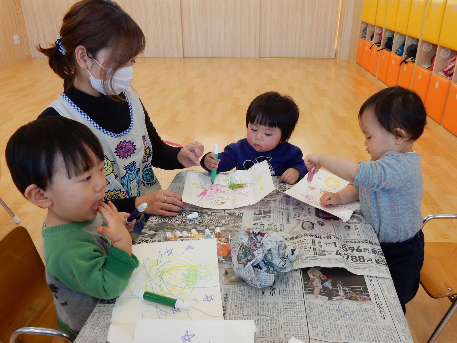 お外に出ないお友達も、お部屋で先生と楽しく遊んでいますよ!今日はお絵描きをしていたみたい!机に新聞紙が敷いてあるので、どこに書いても大丈夫!大きなキャンパスです!みんな手もカラフルにお絵描きしてありましたよ(笑)