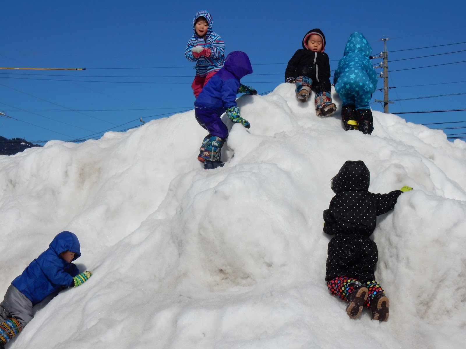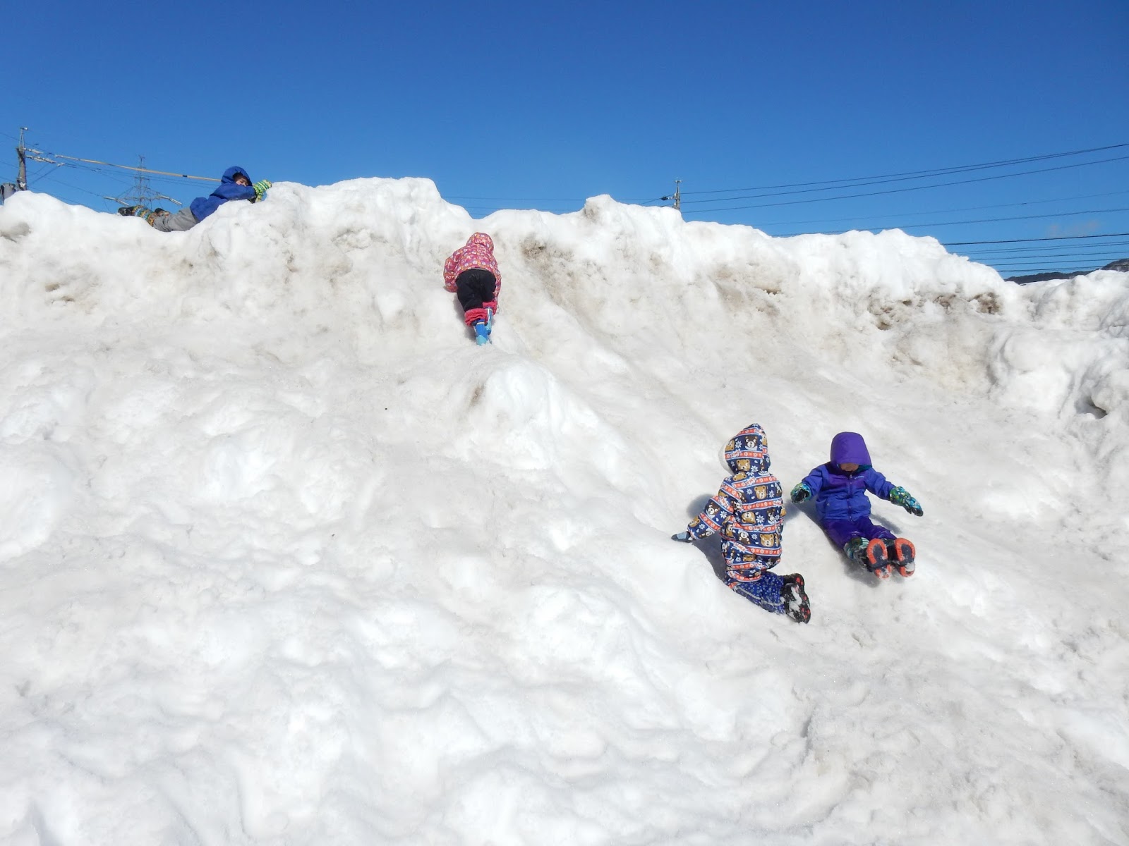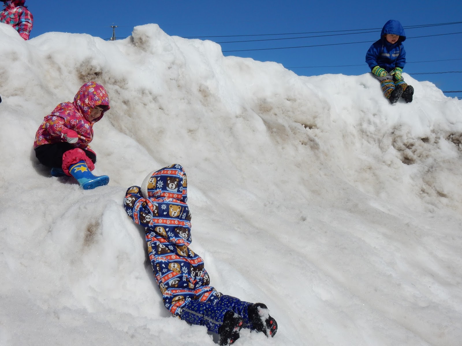園舎裏の駐車場山に遊びに行ったたんぽぽさん。雪山もシャーベット状の雪がツルツル滑って、上からは勢いよく滑り降りる事が出来ますが、その分登るのが大変!友達の手を取って助けようとする優しい姿もありましたが、残念ながら一緒に下まで滑ってしまったり、もう少し!というところで手が届かなかったり(笑)それでもみんなの楽しそうな歓声が響いていました。