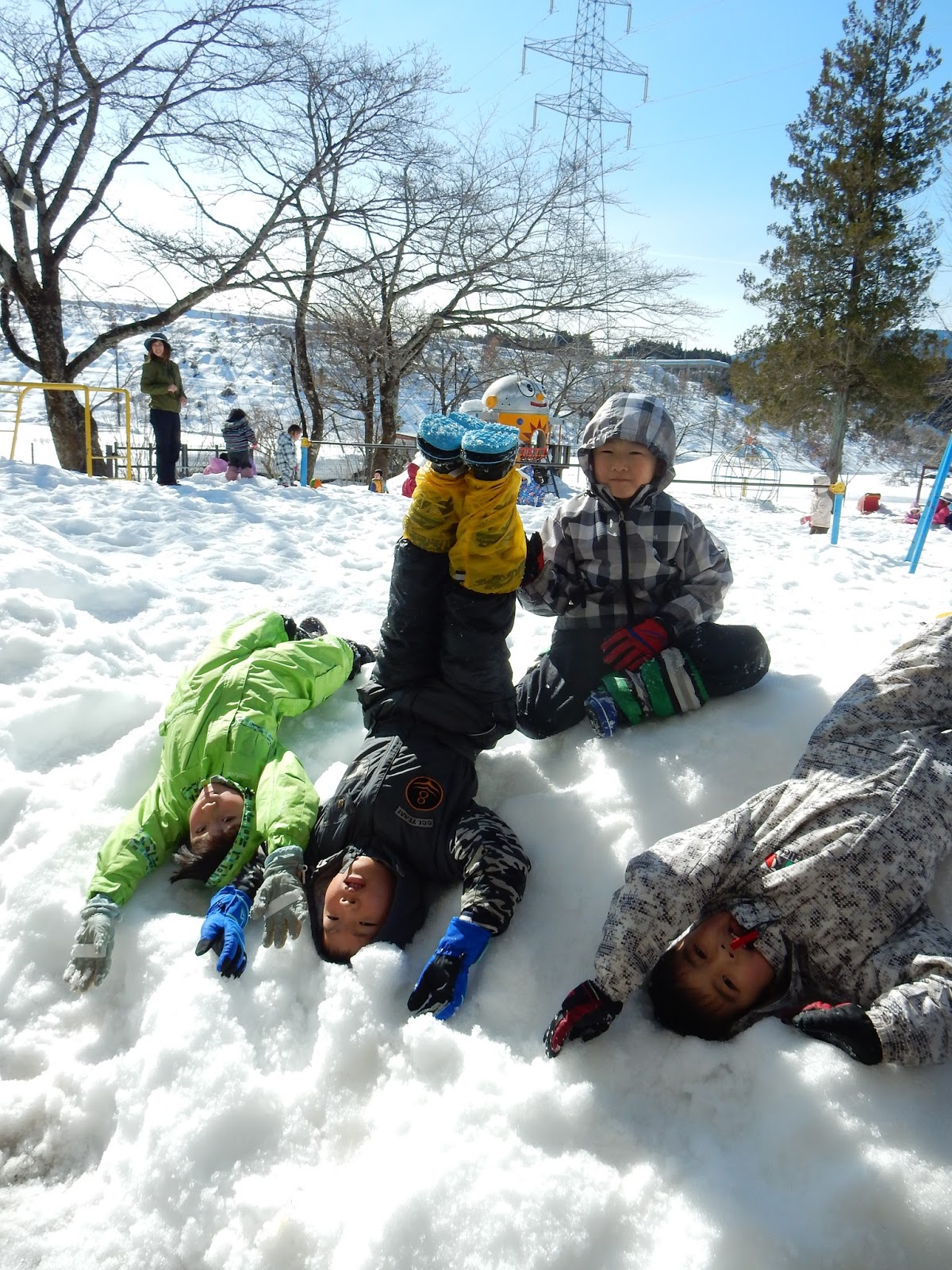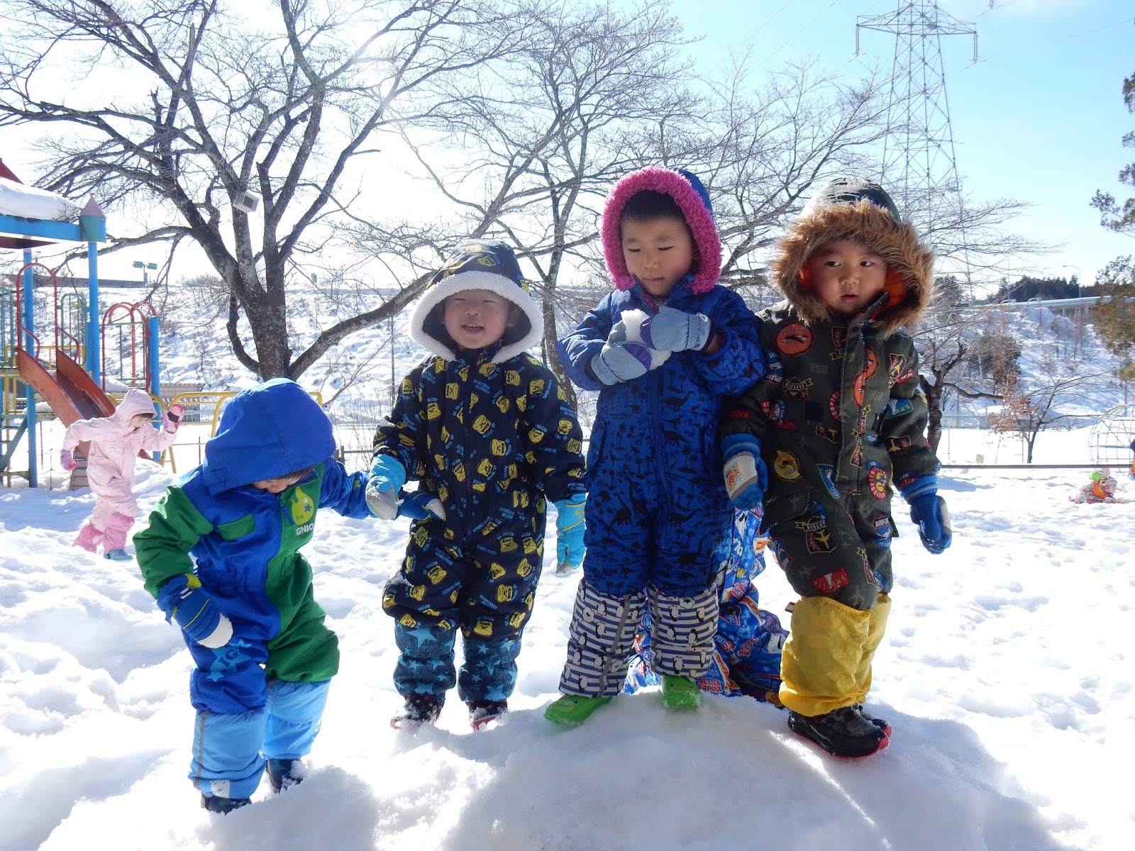 今日はとってもいいお天気♪外遊びも温かくて気持ちが良かったです!スキーウエア―を着た子ども達は、走り回るとあっという間に汗をかくほどでしたよ!