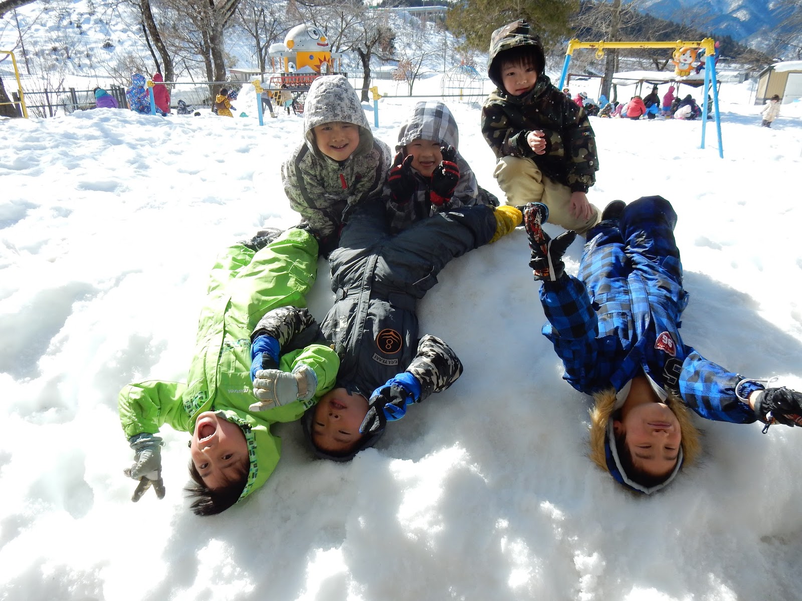 まだまだ園庭の雪はたくさんあります!底上げ効果で、普段は届かない遊具にもバッチリ手が届きます!山の上に登って得意気なすみれさん!つるりと滑って尻もちをついても面白くて笑えてきます!