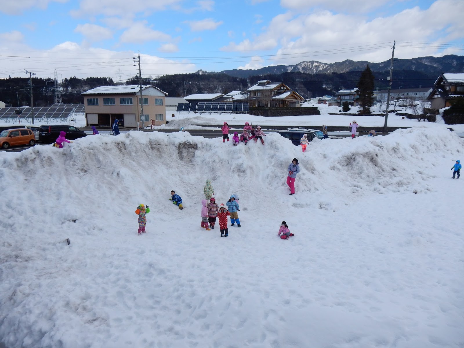 2階の廊下から駐車場の方を見るとゆりさんが遊んでいました!こうやってみると、みんなの遊んでいる雪山の大きさがまた際立ちますね!