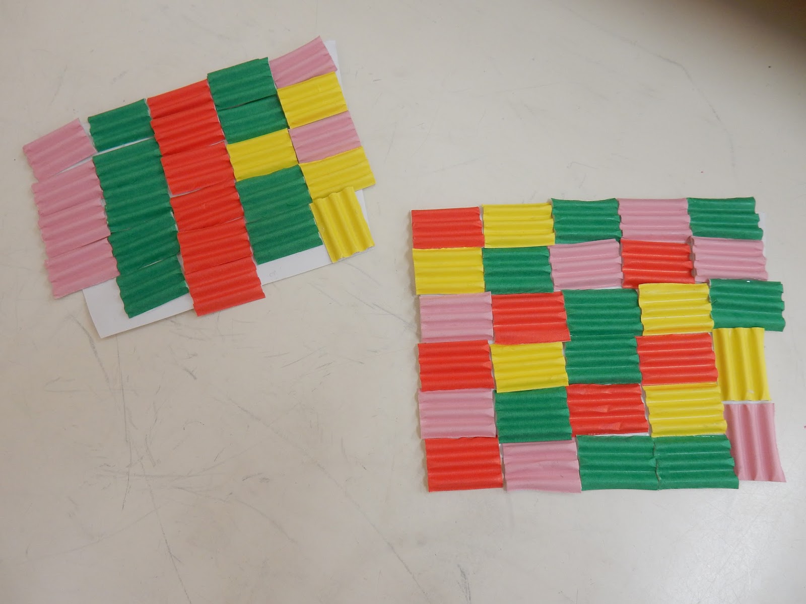 たんぽぽさんの製作は3月の壁面。今回は気球を作るんですって!今日は、気球のカゴ作り。片段ボールがカラフルに並んでいます。まるでブロックみたい!並べ方もそれぞれ違って面白いですね!