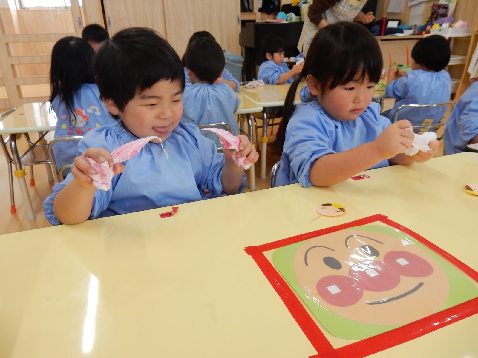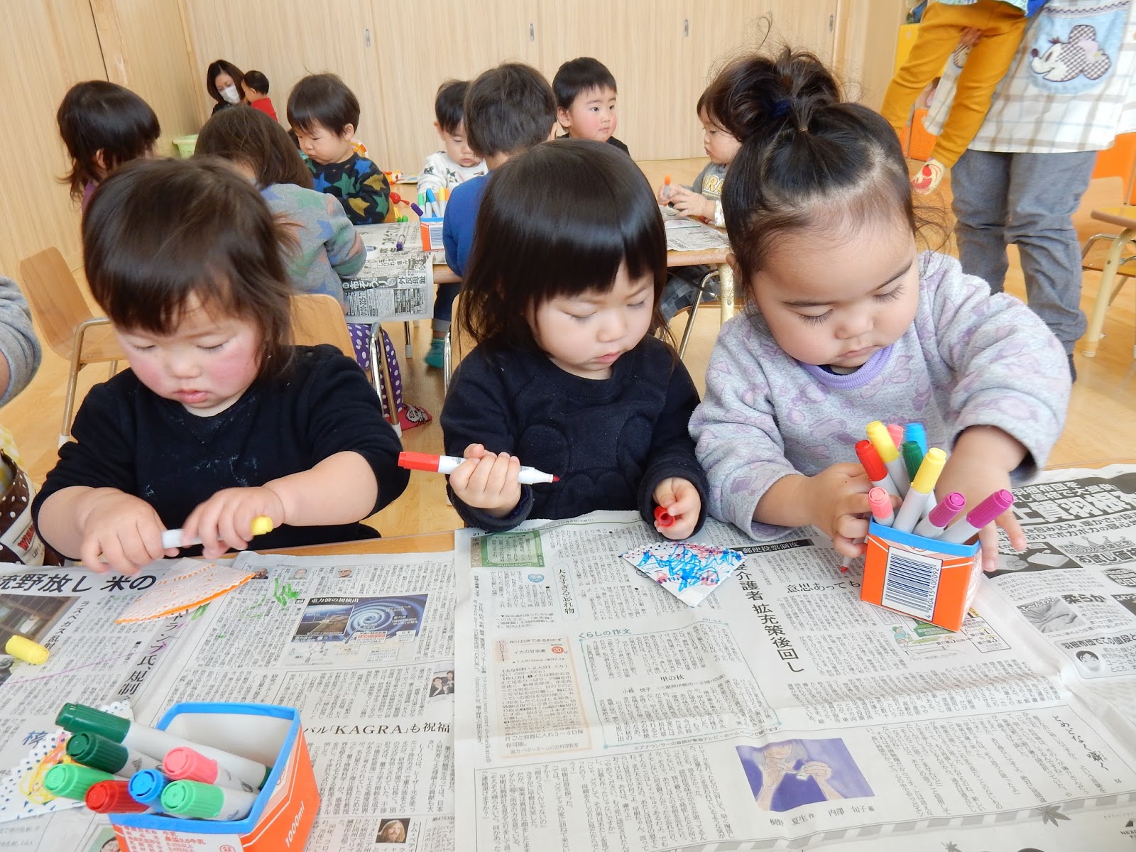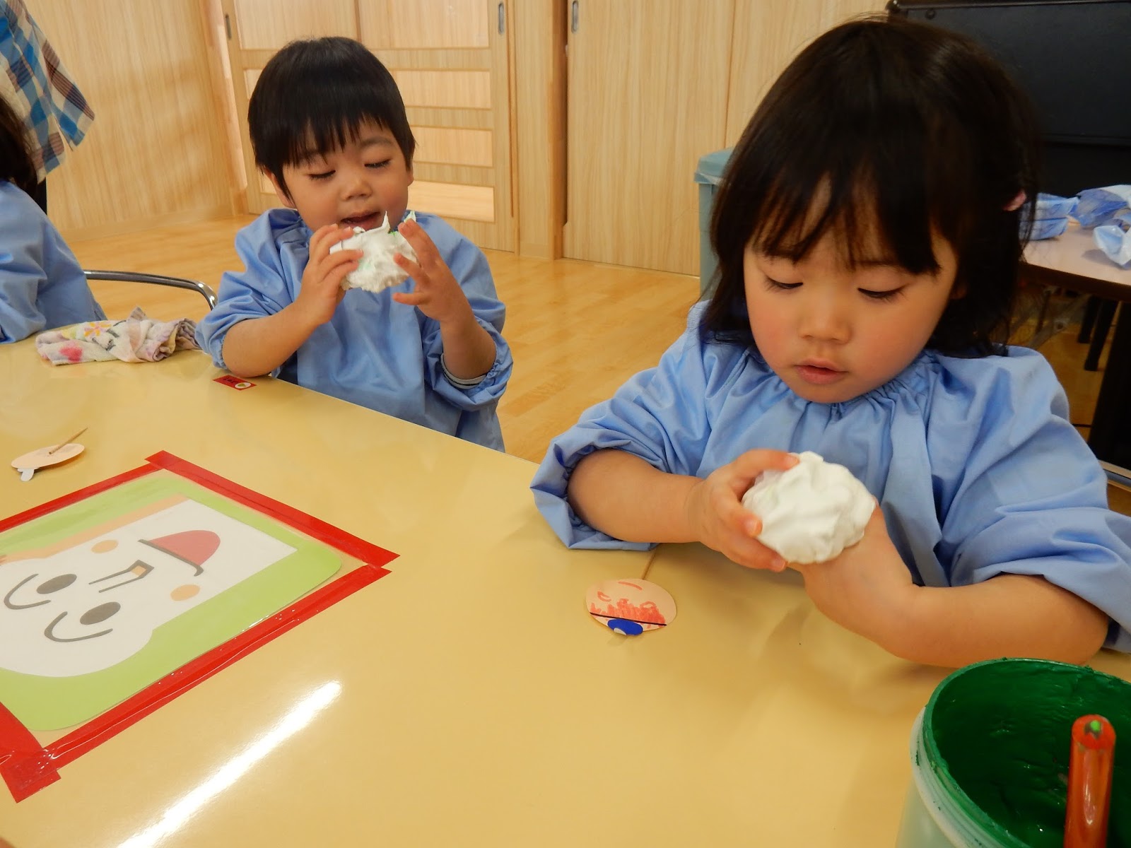 ひよこさんはお雛様作り。マジックで服にお絵描きをしたり、シールを貼って表情を付けます。小さなシールも指先で上手にはがせますよ!いろんな顔のお雛様になりました!