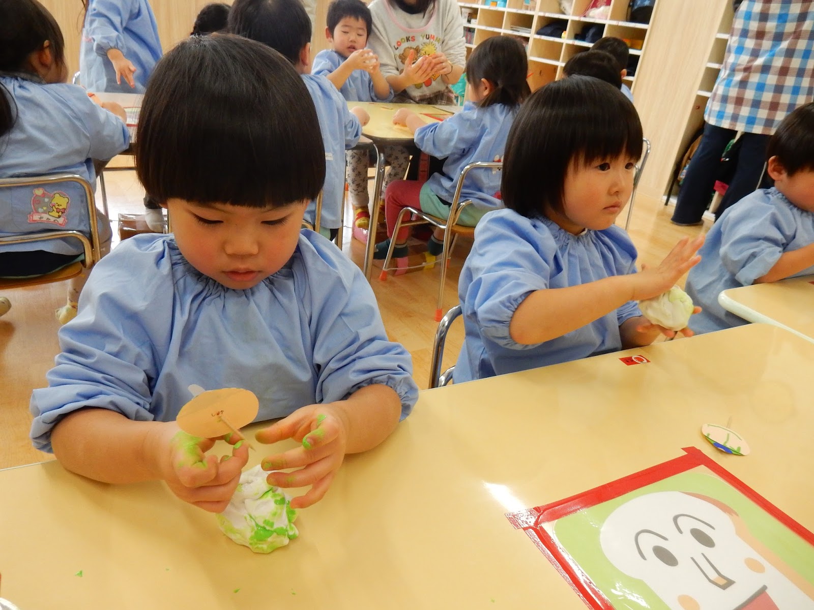 すみれさんは紙粘土に絵の具を混ぜて色をつけます。こねこねしていくと、真っ白だった粘土がマーブル模様に!色の変化をたのしみました! ころりと並んだお雛様、かわいらしいですね!