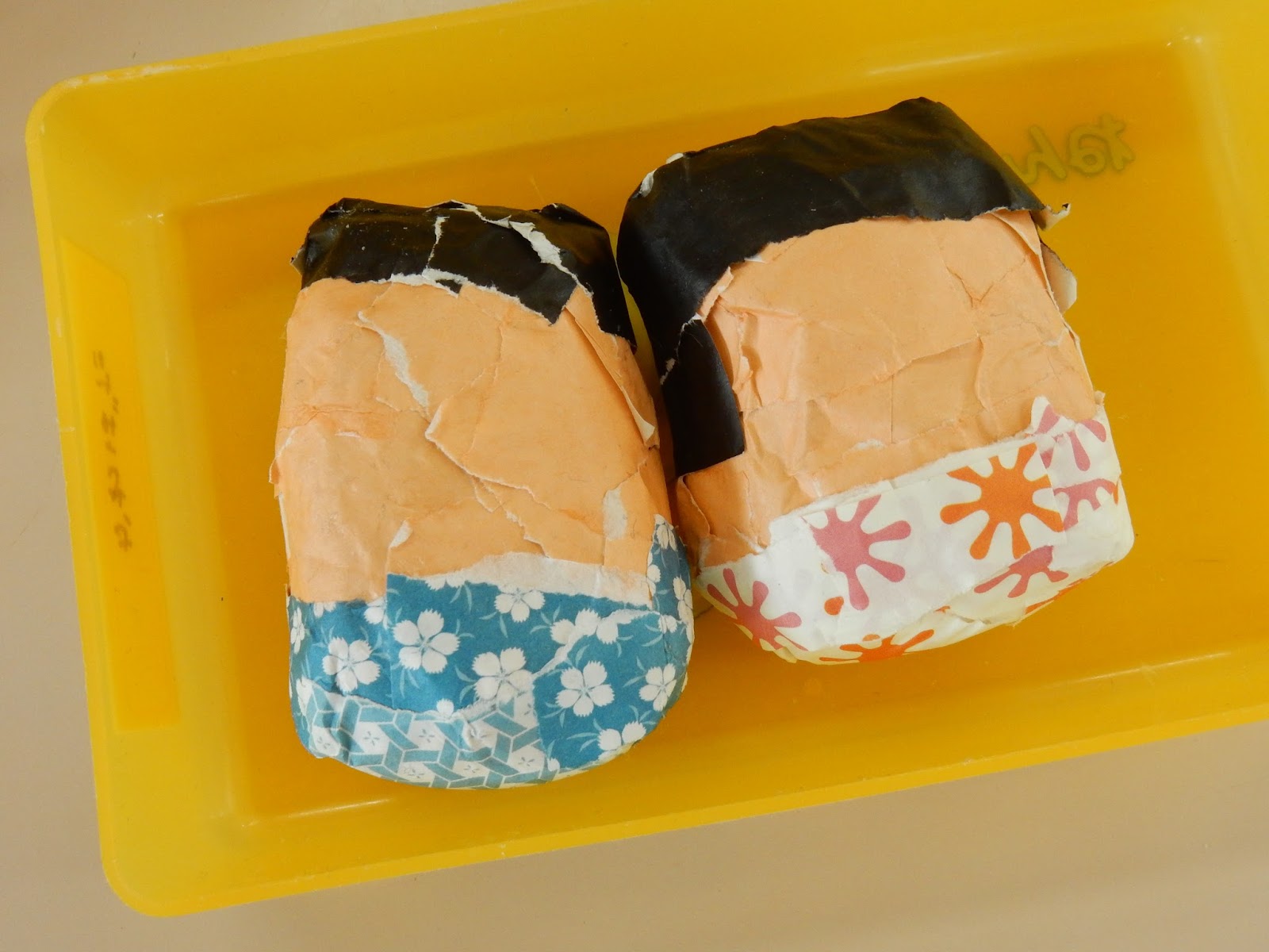 ひまわりさんのおにぎりお雛様も、完成に近づいてきました。画用紙を切って顔の表情を付けたり、冠などの装飾品も自分で作ります。小さなお雛様なので、パーツがとっても細かいんですが、さすがひまわりさん!はさみを上手に使って、素敵なお雛様が出来あがりそうです!