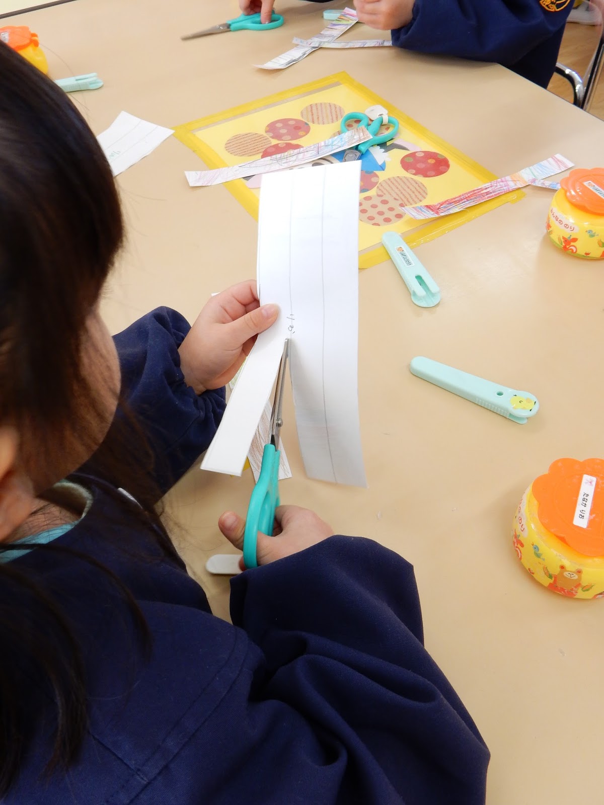 真剣な表情ではさみを使っているのはたんぽぽさん。紙に書いてある線に沿って切るのがとっても上手になったみんな。まっすぐ切った紙は、作品ファイルの表紙になるんですって。ノリで貼っている所も写真に撮ったんですが…やっぱり持ち帰った時のお楽しみにします♡