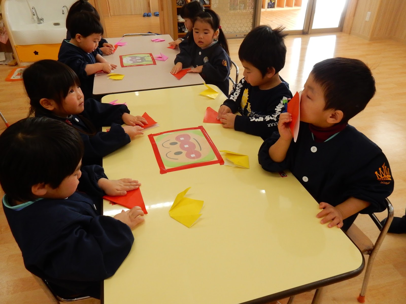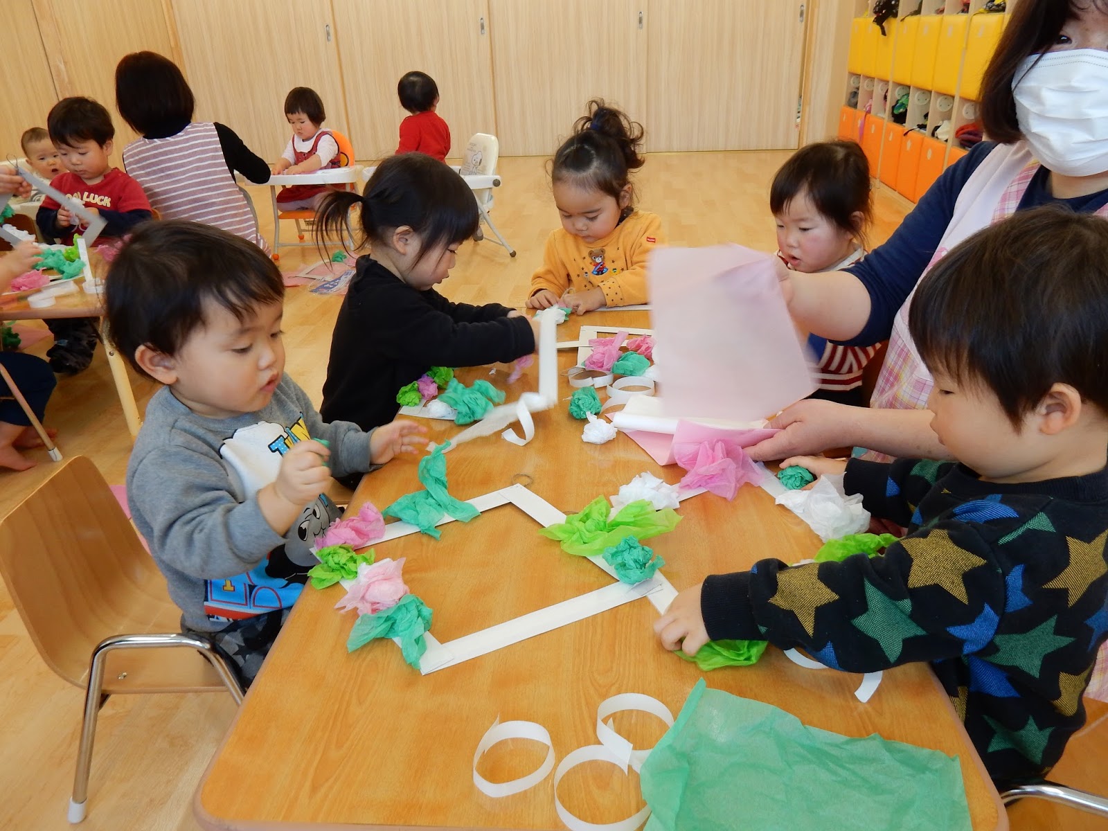 今日はどのクラスも製作をたくさんしていましたよ!ひよこさんは、お雛様のお家作り♪お花紙をたくさんもらったら、みんなでくしゃくしゃ…両面テープをはがしたら土台にどんどん貼っていきます。ふわふわの花紙がたくさんついてとっても可愛らしくなりましたよ♪
