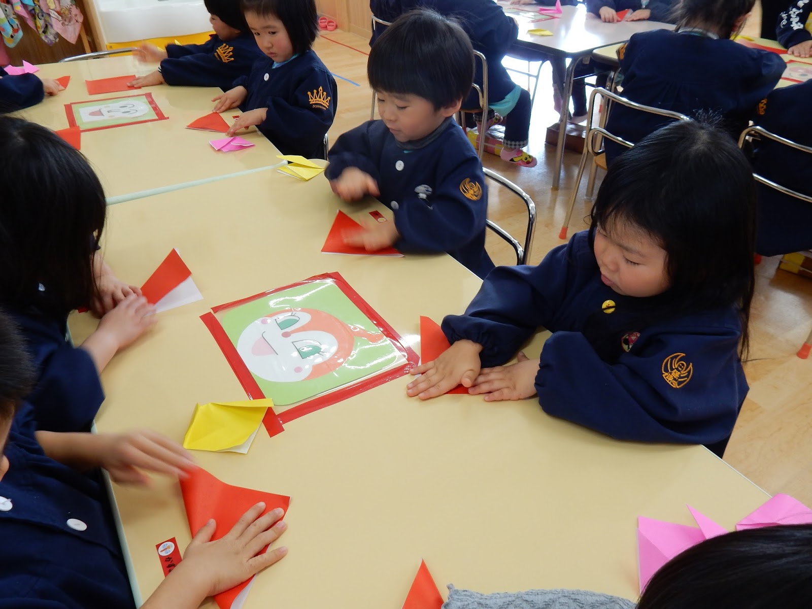 みんなが先生の方をじーっと見ながら折り紙をっているのはすみれさんのお友達です。お山を作って、角を出して…先生の説明通りに折っていくと、カラフルなチューリップが完成しましたよ!子ども達には、ネコに見えたり、犬に見えたり、鬼さんに見えたり、いろんなイメージができたみたいですよ!