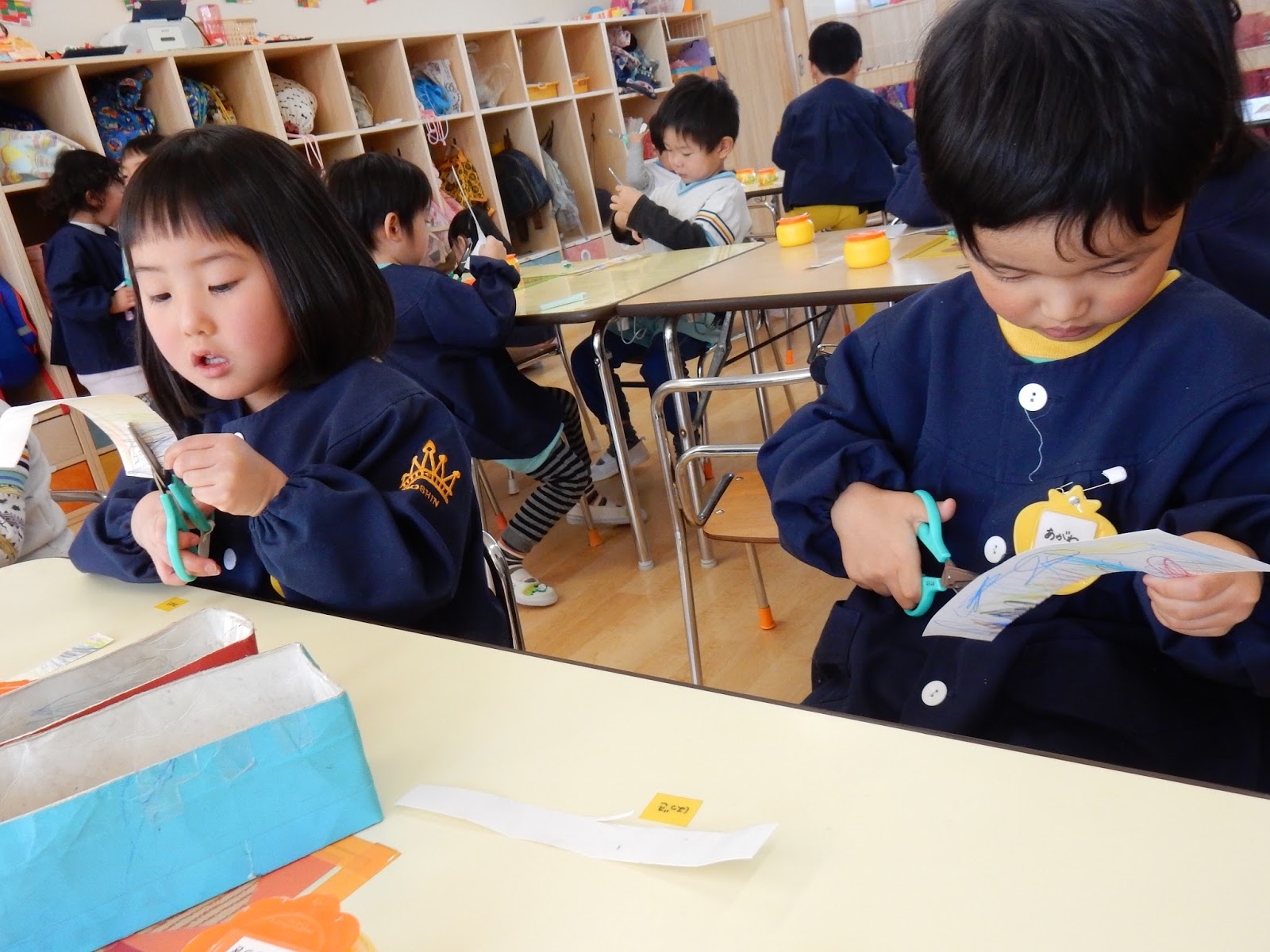 ゆりさんも折り紙を使った製作をしていました!鉛筆で線を付けた折り紙をはさみでちょきちょき。開くとかわいらしい模様ができましたよ!桃の花ですって!お雛様を飾る土台ができあがりました!同じ折り紙でも、切る場所、切り方が変わると全然違う模様が出来あがり、お友達同士で見せ合いっこ!ここにどんなお雛様が飾られるのか♪楽しみです!