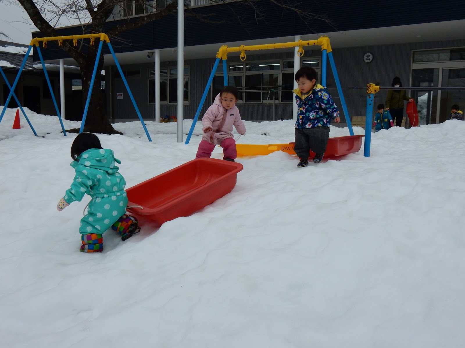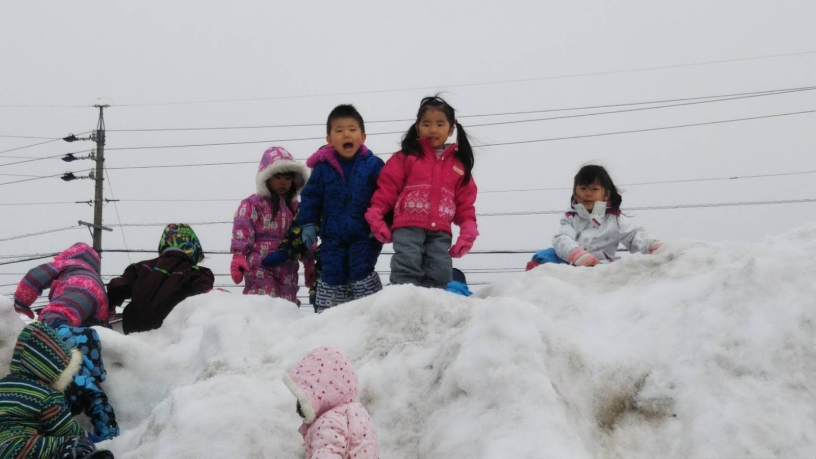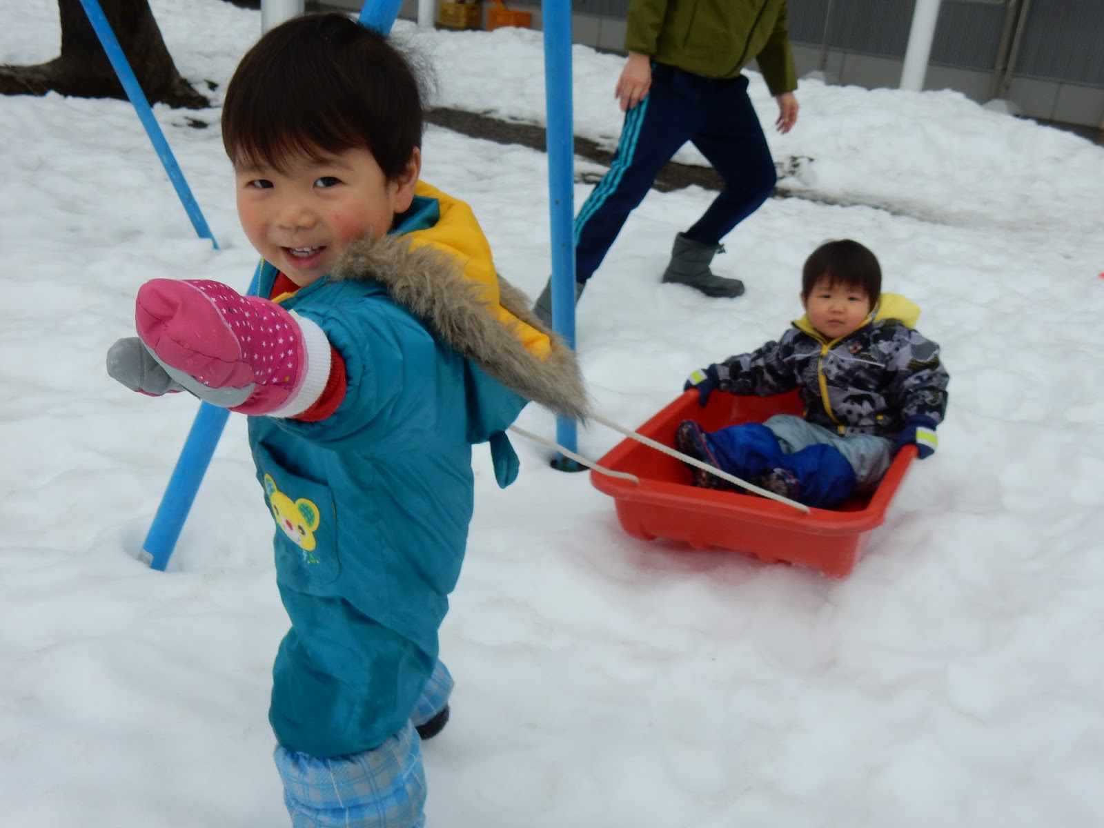 園庭で遊ぶひよこさんも、とっても楽しそう!ソリやスコップも上手に使いこなせるようになり、自分たちで色々なあそびを進めていきます。少なくなってきた雪も、ひよこさんにとっては歩きやすくてちょうどいいですね!