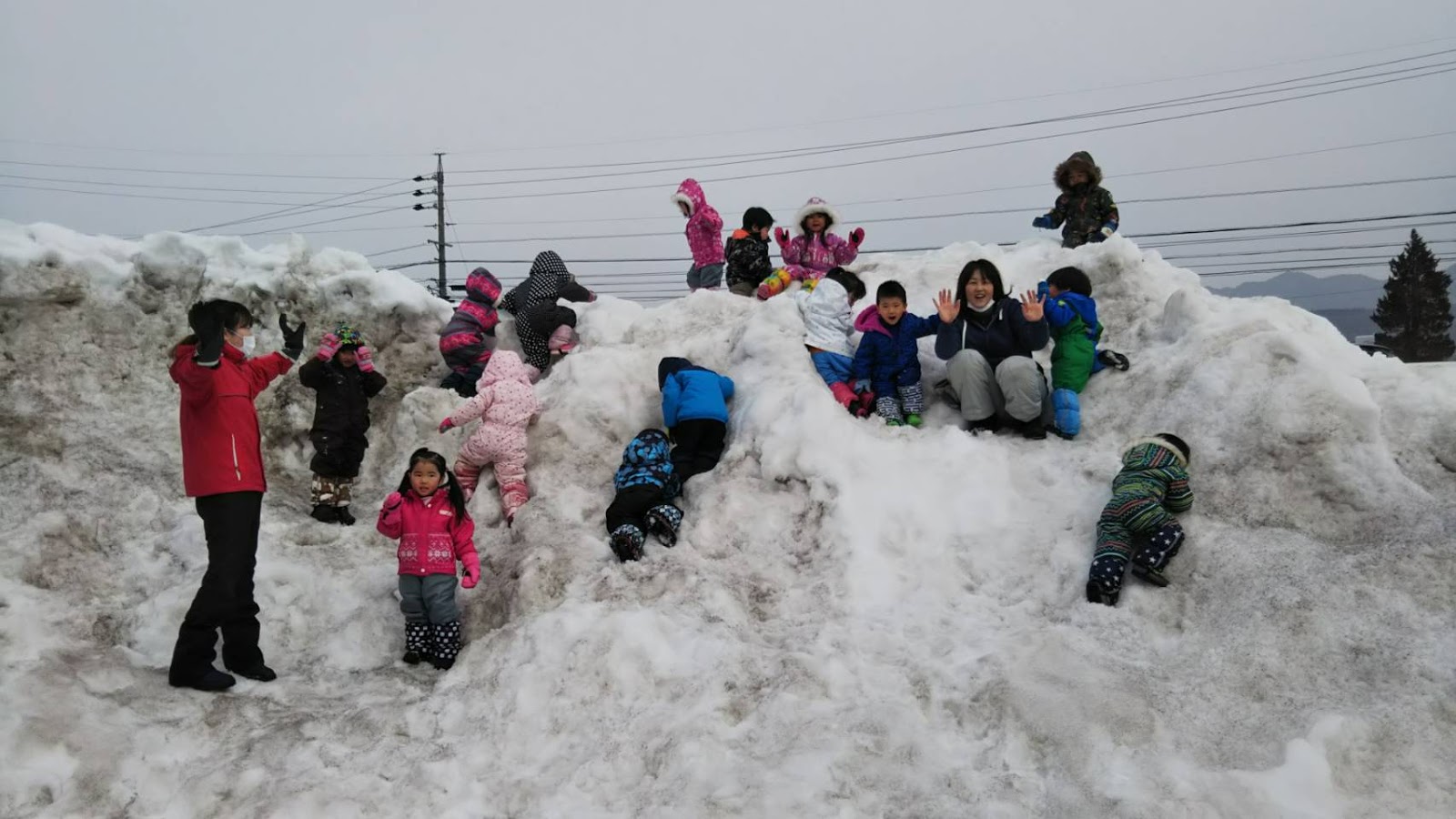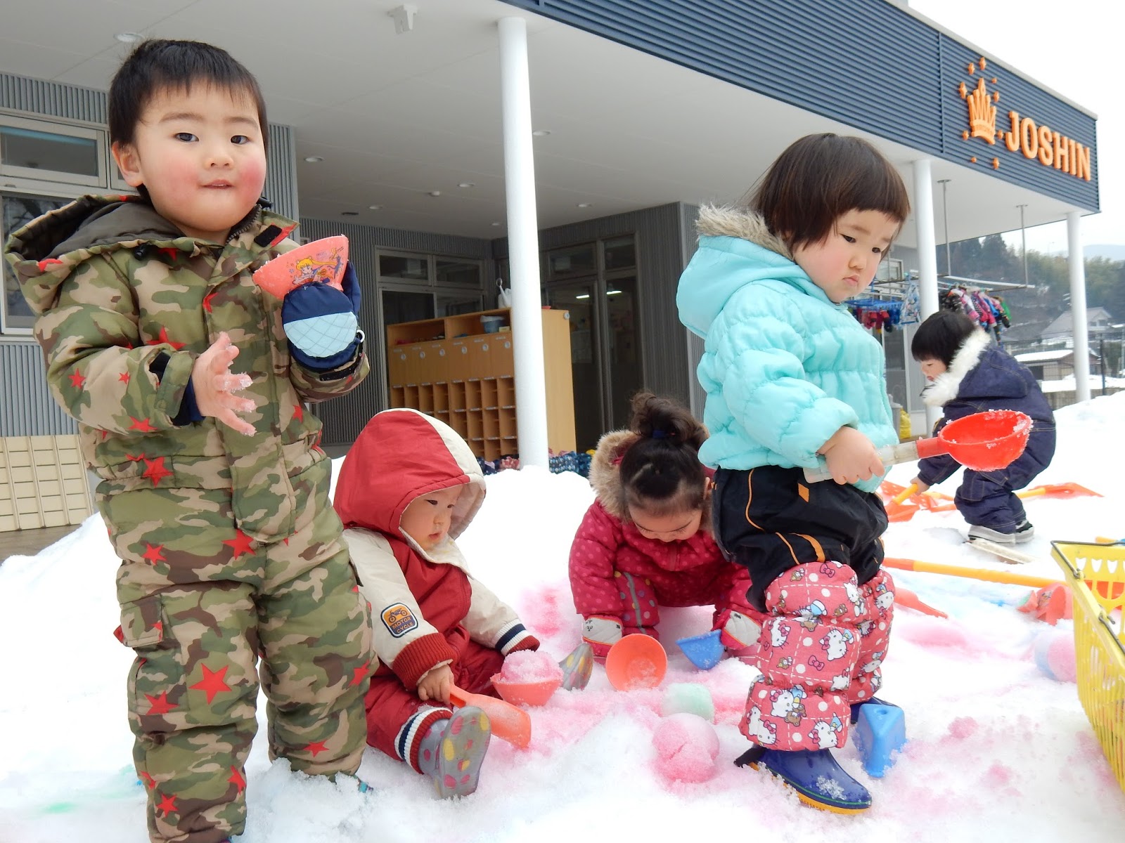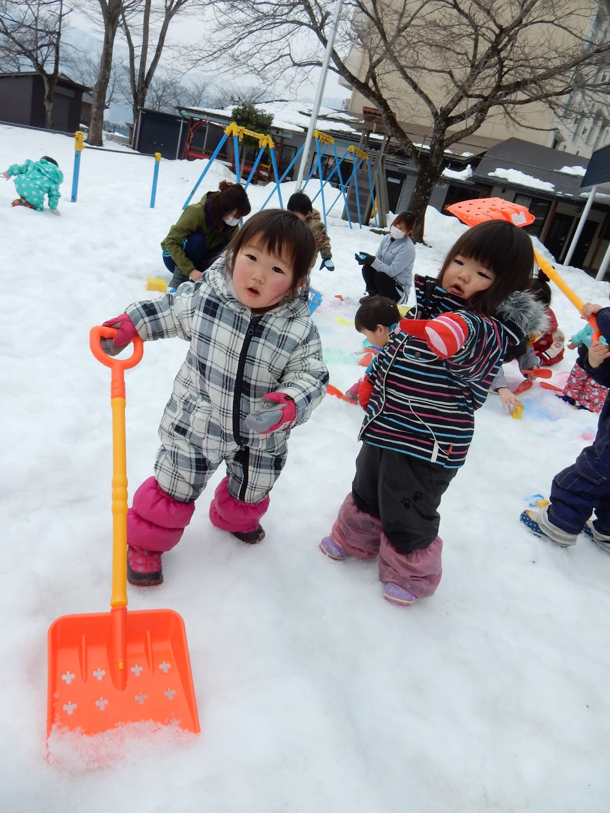 園庭で遊ぶひよこさんも、とっても楽しそう!ソリやスコップも上手に使いこなせるようになり、自分たちで色々なあそびを進めていきます。少なくなってきた雪も、ひよこさんにとっては歩きやすくてちょうどいいですね!