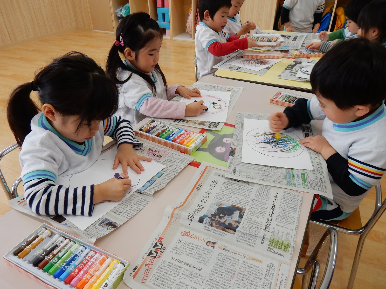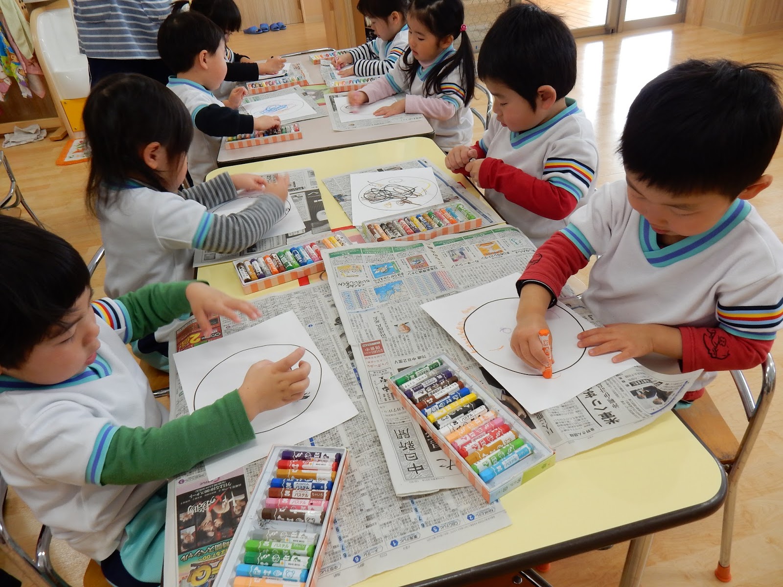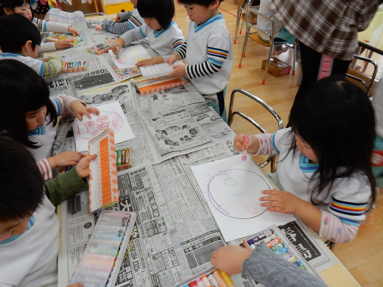 お部屋に戻ったすみれさんはみんなでお絵描き。今日は、自分のお顔を描いたんですって!目はどこかな??お口は??髪の毛はどんな風かな??ニッコリ笑った可愛らしいお顔ができましたよ!