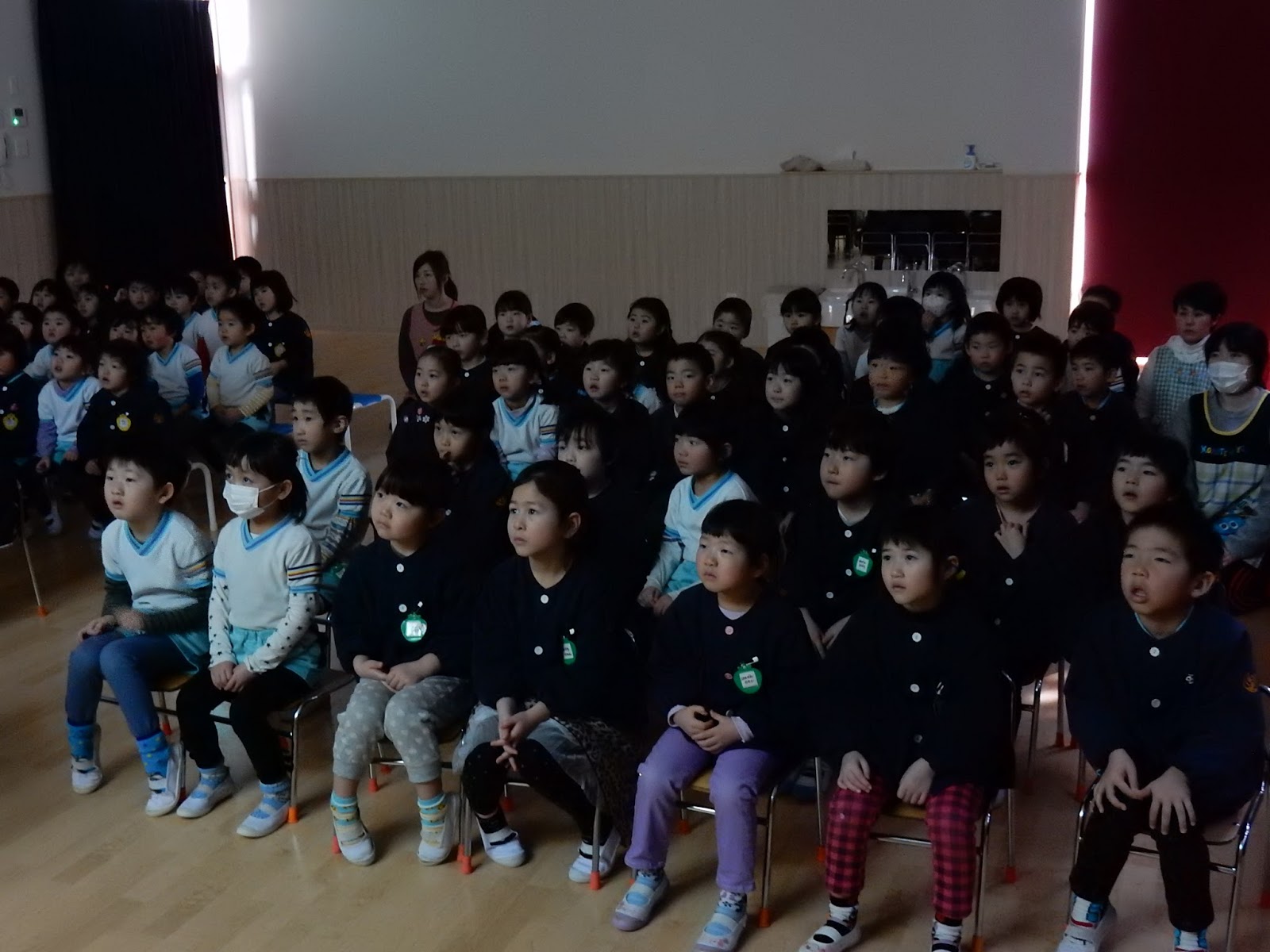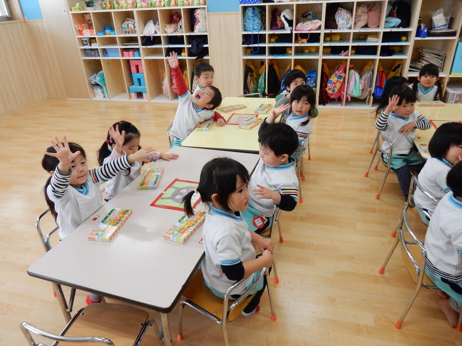 大きいクラスは最後のおつとめでした。正信偈の経本15ページを園長先生の後について読んでいきました。みんな姿勢がとってもいい!!と褒めていただきましたよ!今日もDVDをみました。今日は、“地獄”がテーマの少し怖いお話。悪いことをしたら地獄に行くの??(汗)心配そうな表情のお友達もいましたが、みんなはきっと大丈夫!嘘をついたり、人の物を取ってしまったり…そんなことはしないようにしようね!とお約束。