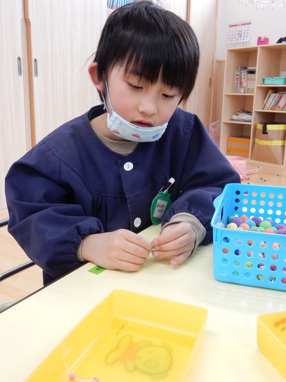 真剣な表情で細かい作業をしているひまわりさん。ストローをテグスに通してキーホルダー製作。『あぁ!!!通らん!』と本音がポロリ(笑)がんばれ、がんばれ!