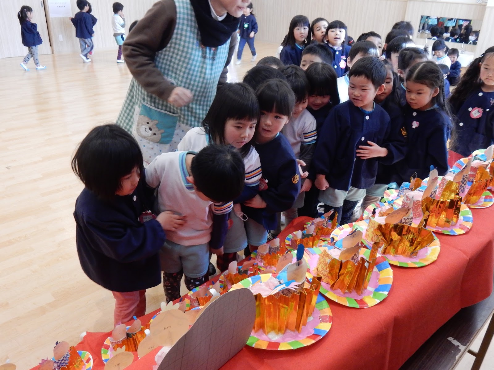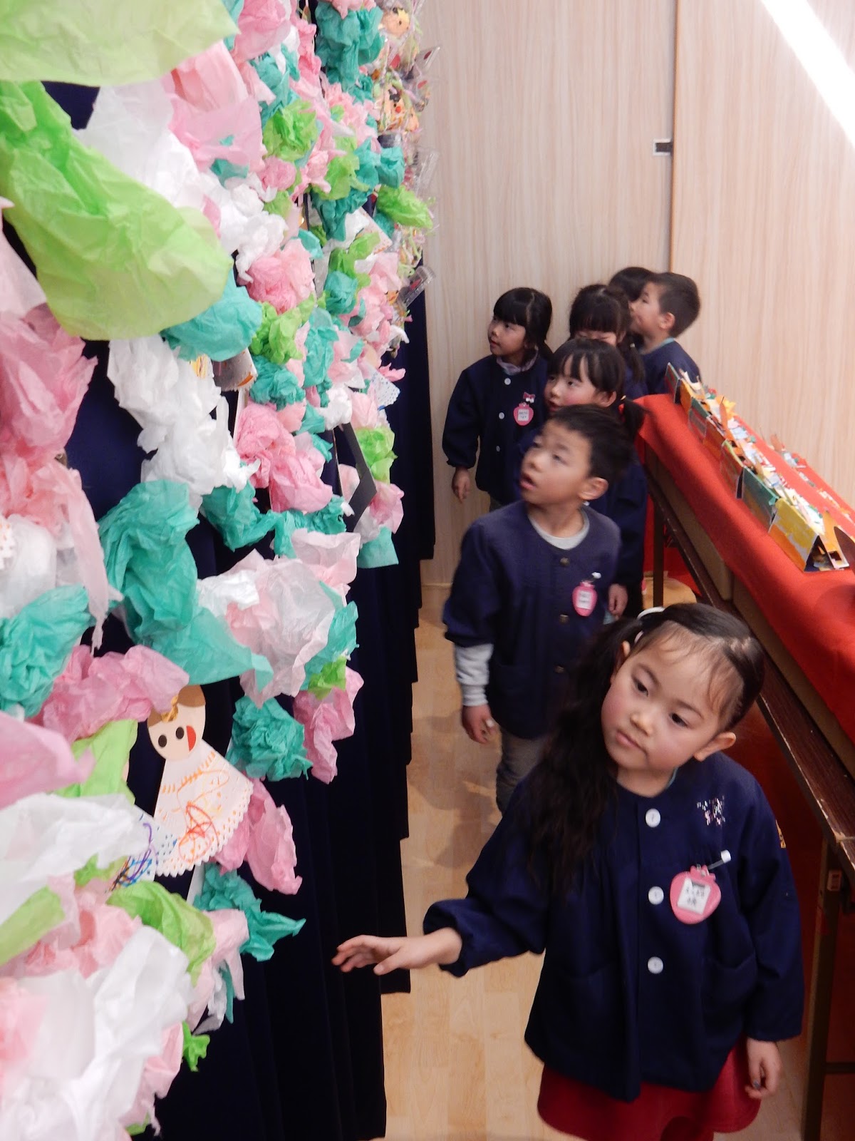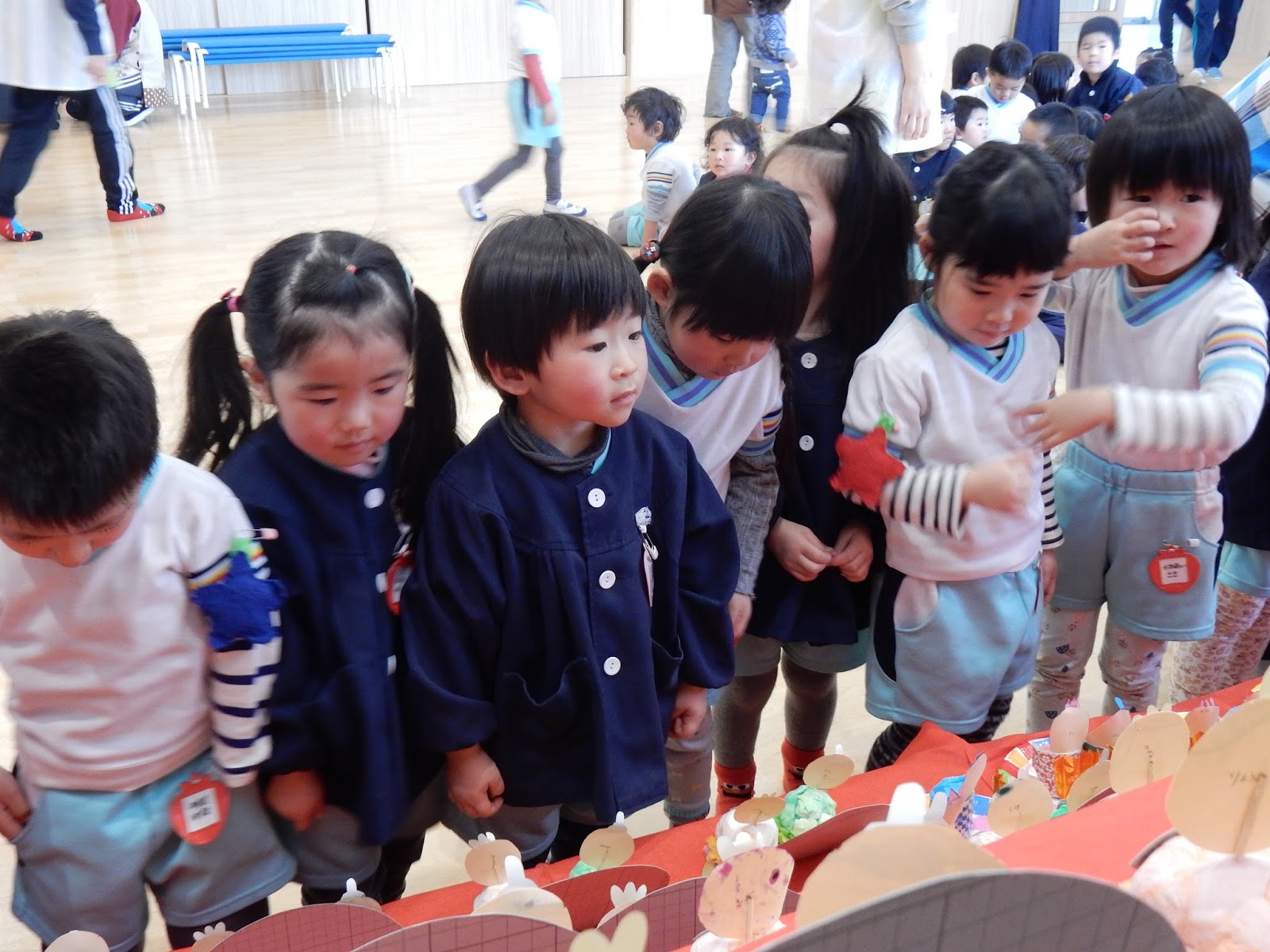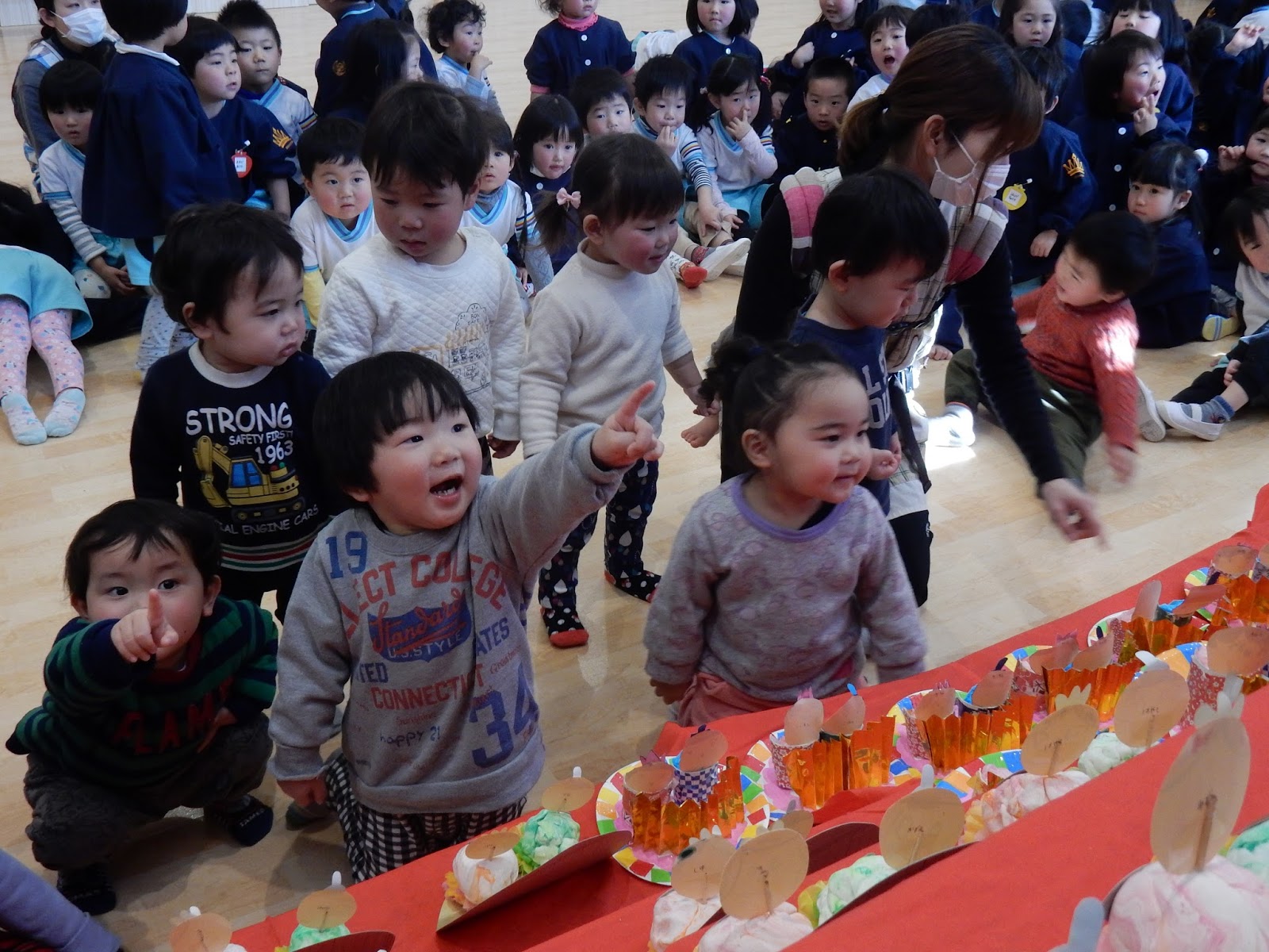 みんなの作ったひな人形を見て回りました!自分の作品を見つけて喜んだり、兄弟のもの、お友達のものをじっくり見ましたよ。年齢によっていろんな作品が並び、『これかわいいなぁ!』 『上手にできたなぁ』なぁんて声も♡お雛様は、今日おうちに持ち帰りますので、じっくりご覧くださいね!