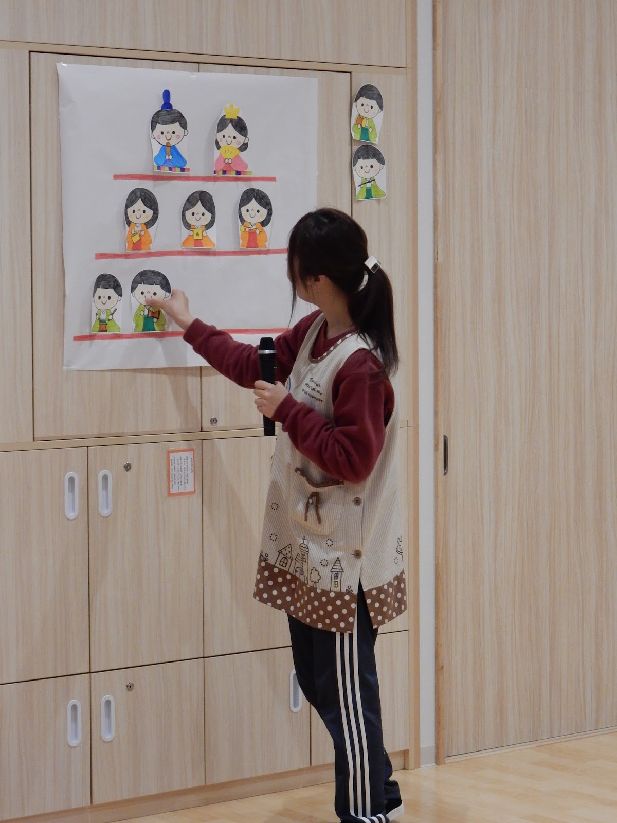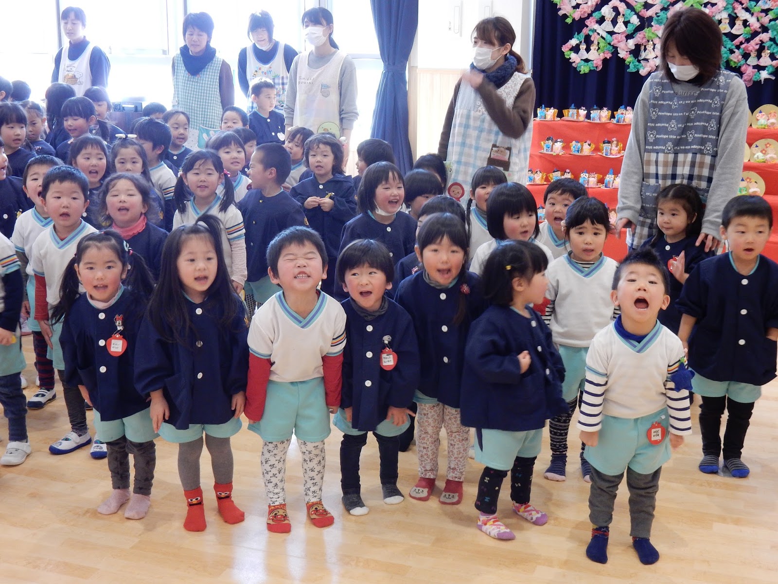 お雛様の並び方が、三人官女、五人囃子のもっているものなど、あやか先生がいろいろ教えてくれましたが、みんなよ~く知っていますね!お部屋で聞いたのか、並び方なんかは、大きいクラスのお友達が大きな声で教えてくれました!
