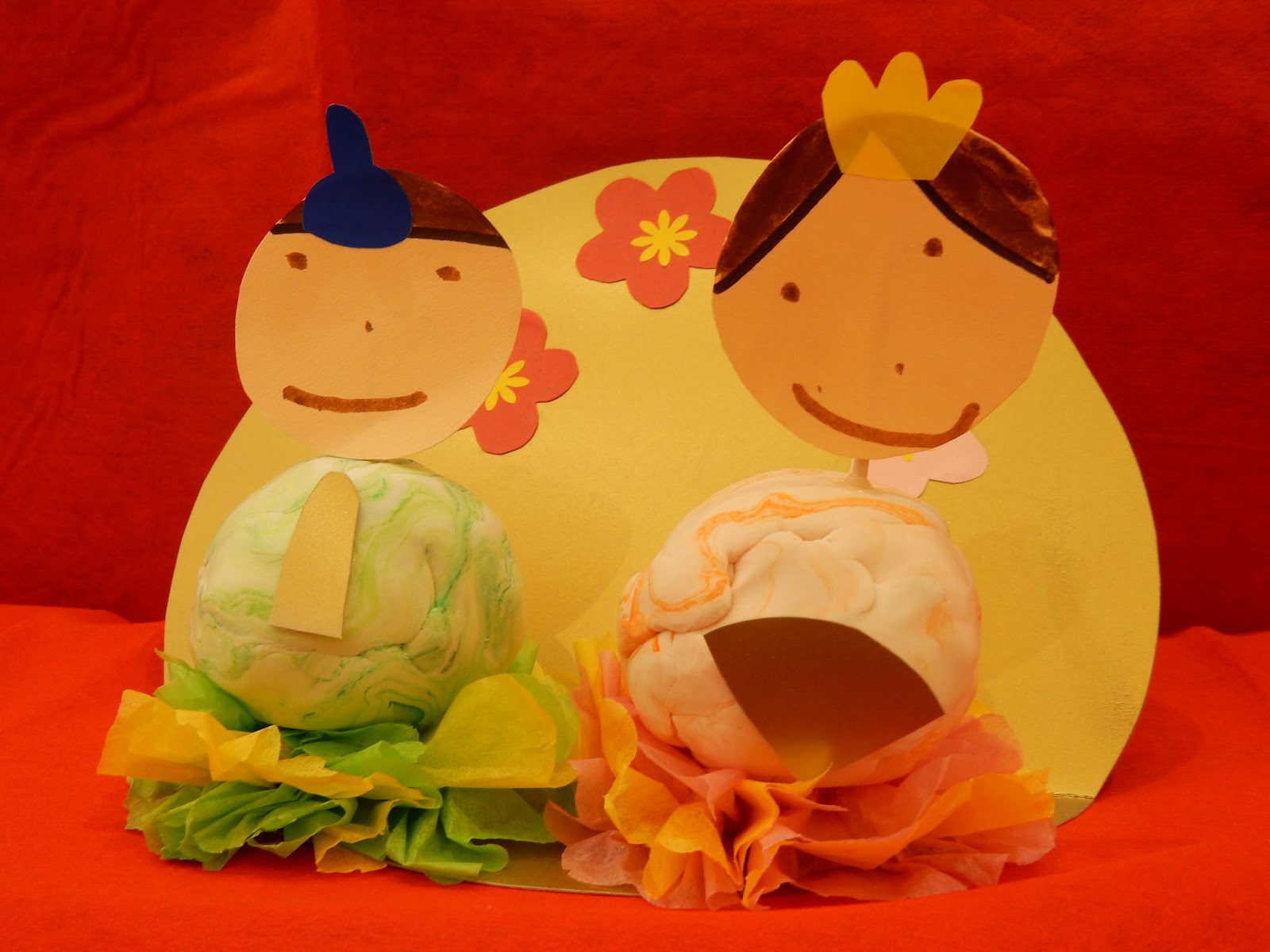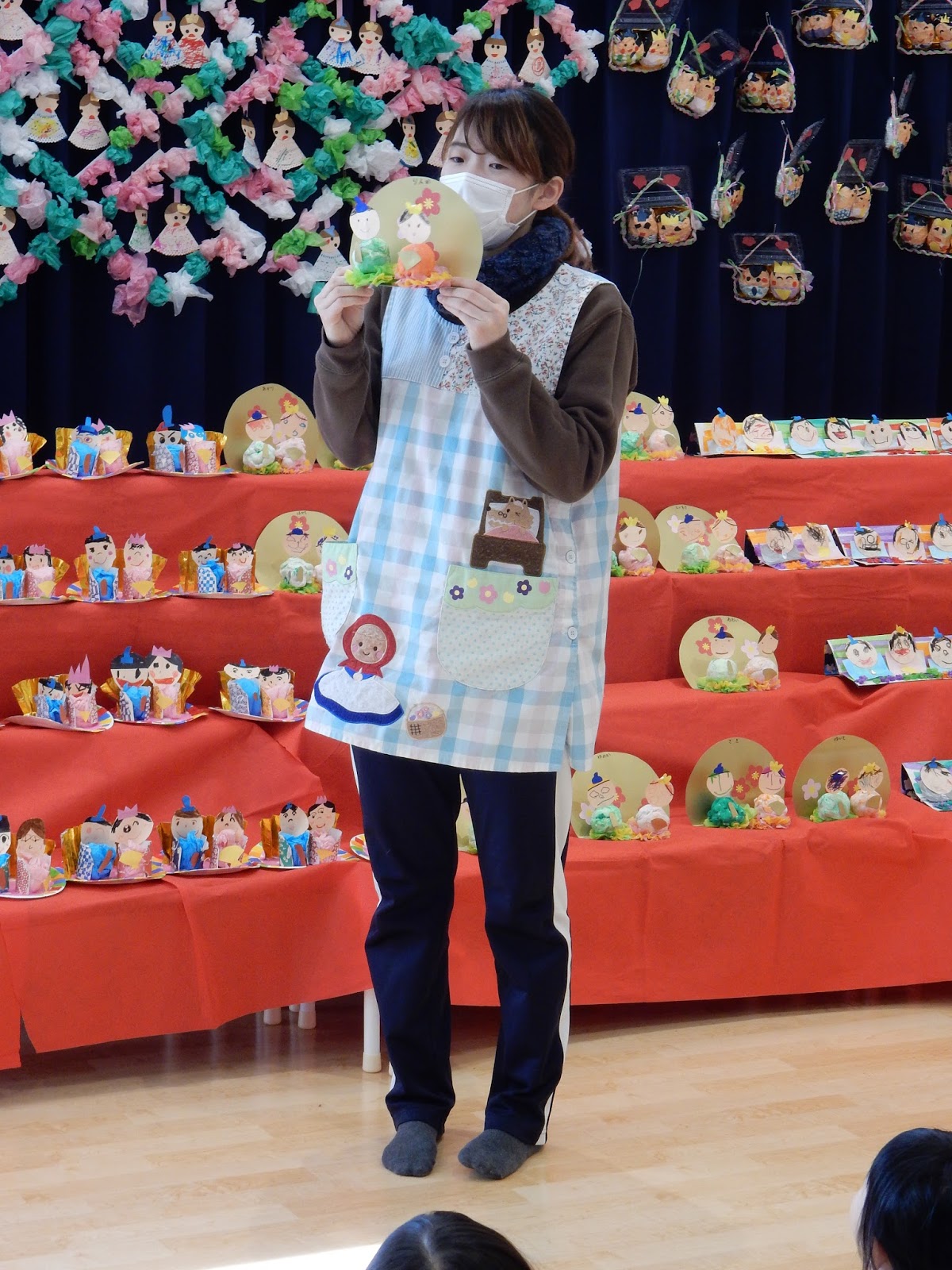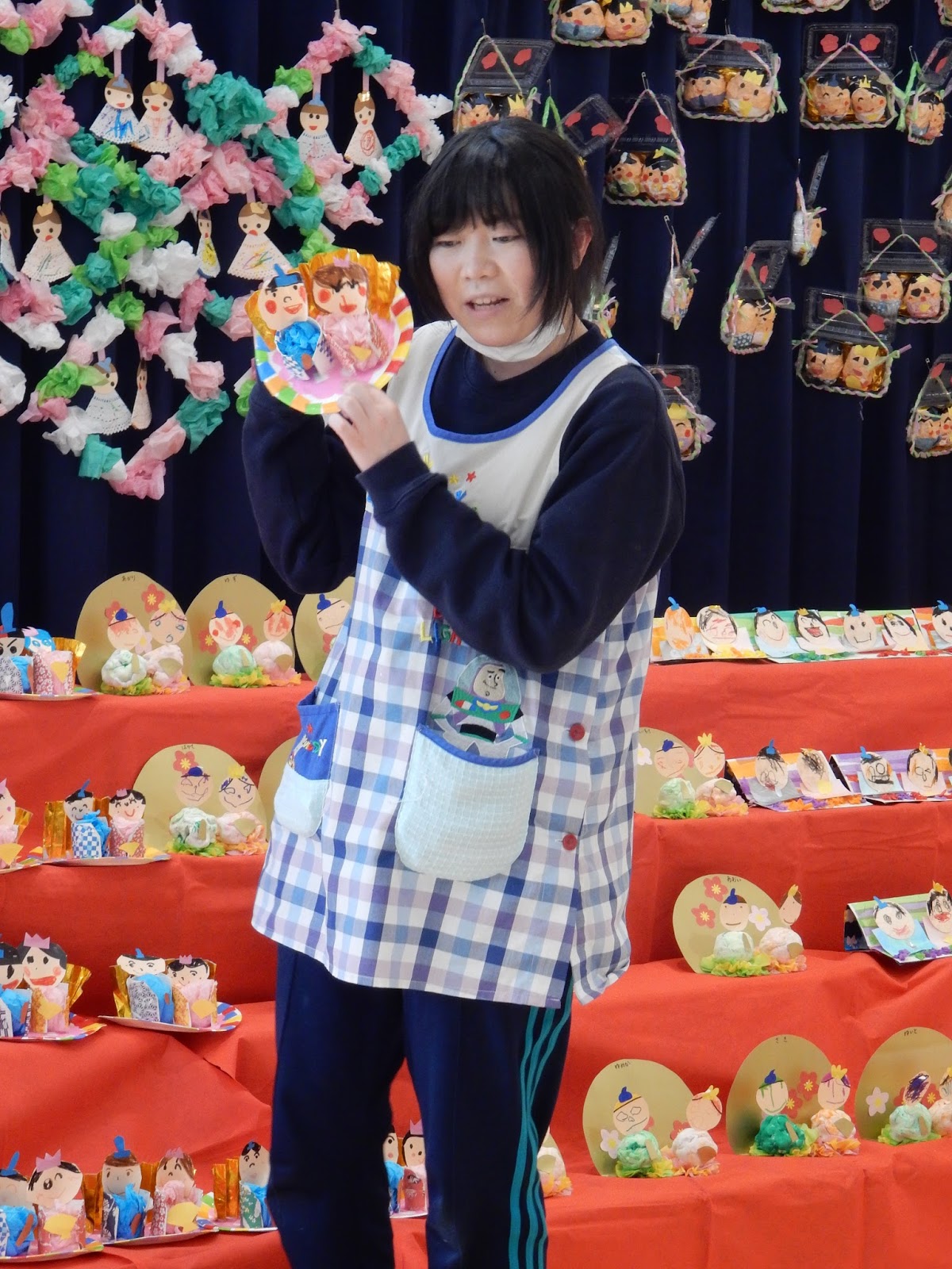 その後は、各クラスごとに手作りお雛様の紹介をしました。どんな素材を使ったのか、どんな風に作ったのかを先生たちが教えてくれました。ひまわりさんの紹介は、2人のお友達やってくれましたよ!みんなの前で堂々と紹介する姿は、さすが年長組さん!とっても分かりやすく、丁寧に教えてくれました。