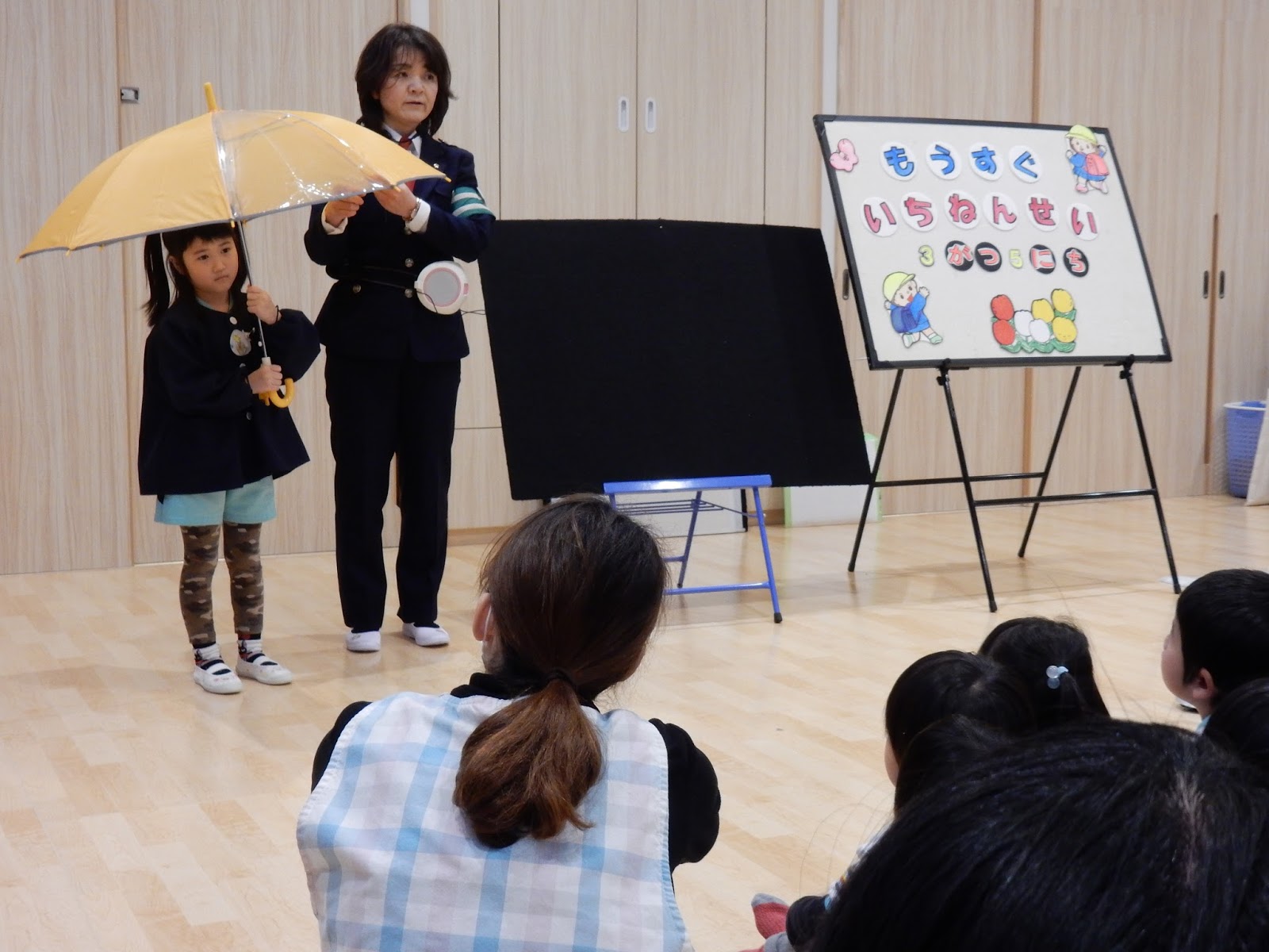 昨年実際に起こった小学生の傘さし事故。そのお話を真剣に聞くみんな。傘のさし方も、改めて確認します。前やうしろがしっかり確認できるように、両手でまっすぐ持つことが大切。年長さんは、1年生になるとこうして歩いて通学しなければなりません。1年生が事故にあう確率が一番高いんですって!みんなで気を付けましょう!