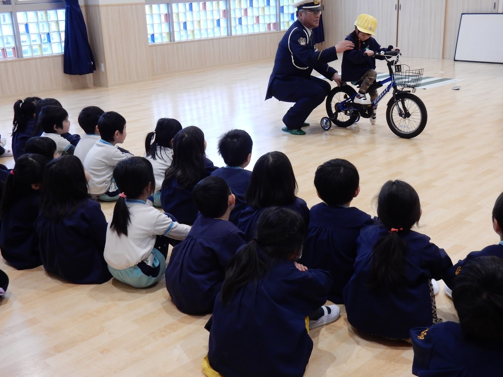 年長さんは、自転車指導もしていただきました。左側から乗って、左側に降りる。というルールや、左右だけでなく後ろも確認すること。ブレーキは左、右の順でかけることなどを教えていただきました。お話を聞いた後は、実際に外で自転車に乗ってみましたよ。