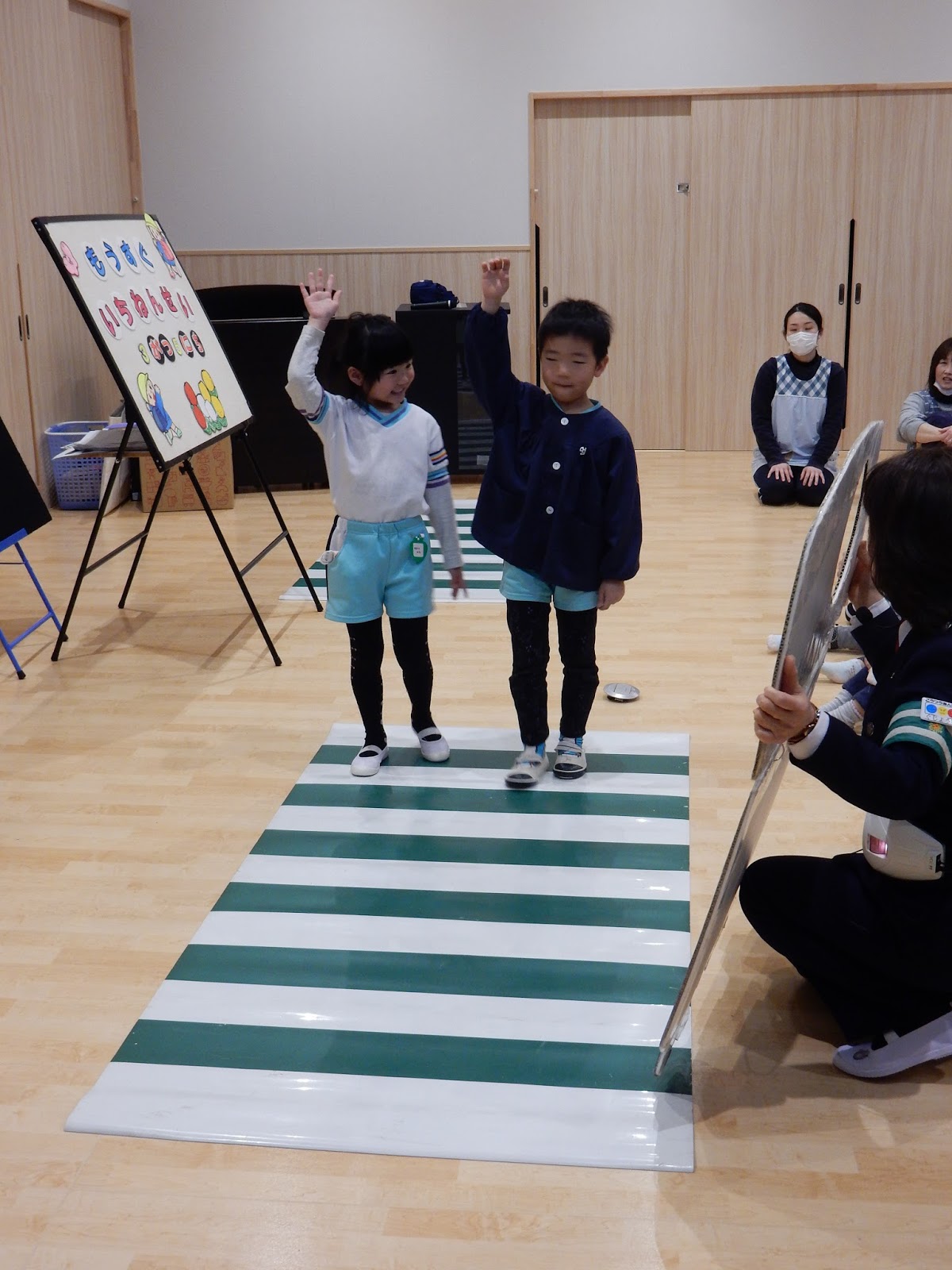 信号の色の意味は、楽しいお歌でみんなしっかり覚えています。ここでも、ひまわりさんがみんなの前でお手本を見せてくれましたよ!