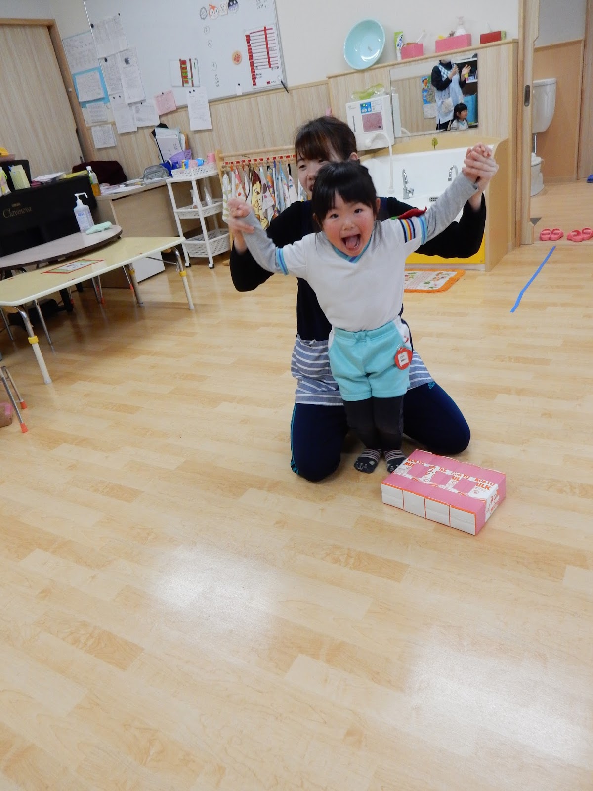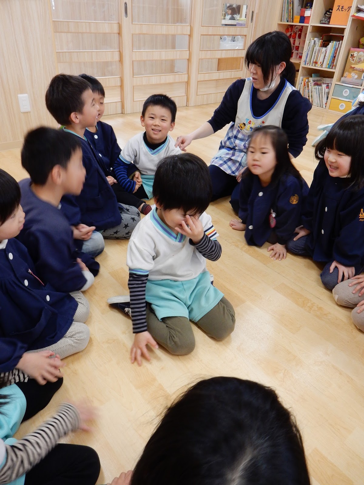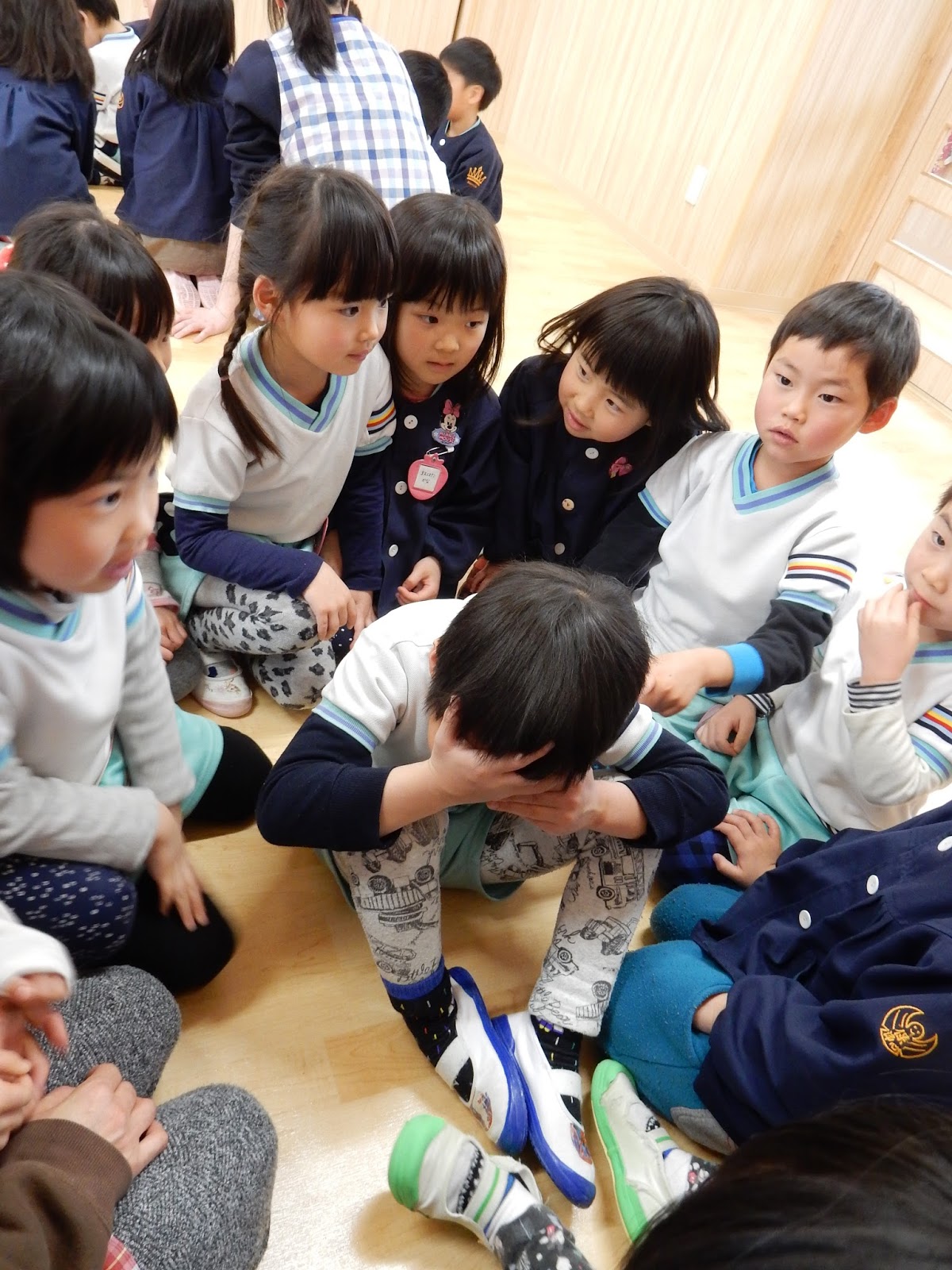 ゆりさんからは、“かごめかごめ”が聞こえてきました。真ん中の王様を囲んで輪になり、歌を歌いながらみんなで回ります。『後ろの正面、だ~ぁれ??』周りの子からヒントをもらって、後ろに座った子を当てます。バスで来る子かな?男の子?女の子??と聞いていくと、みんなよくわかるんですね!大正解!!!お友達に当ててもらえると嬉しいですね♪