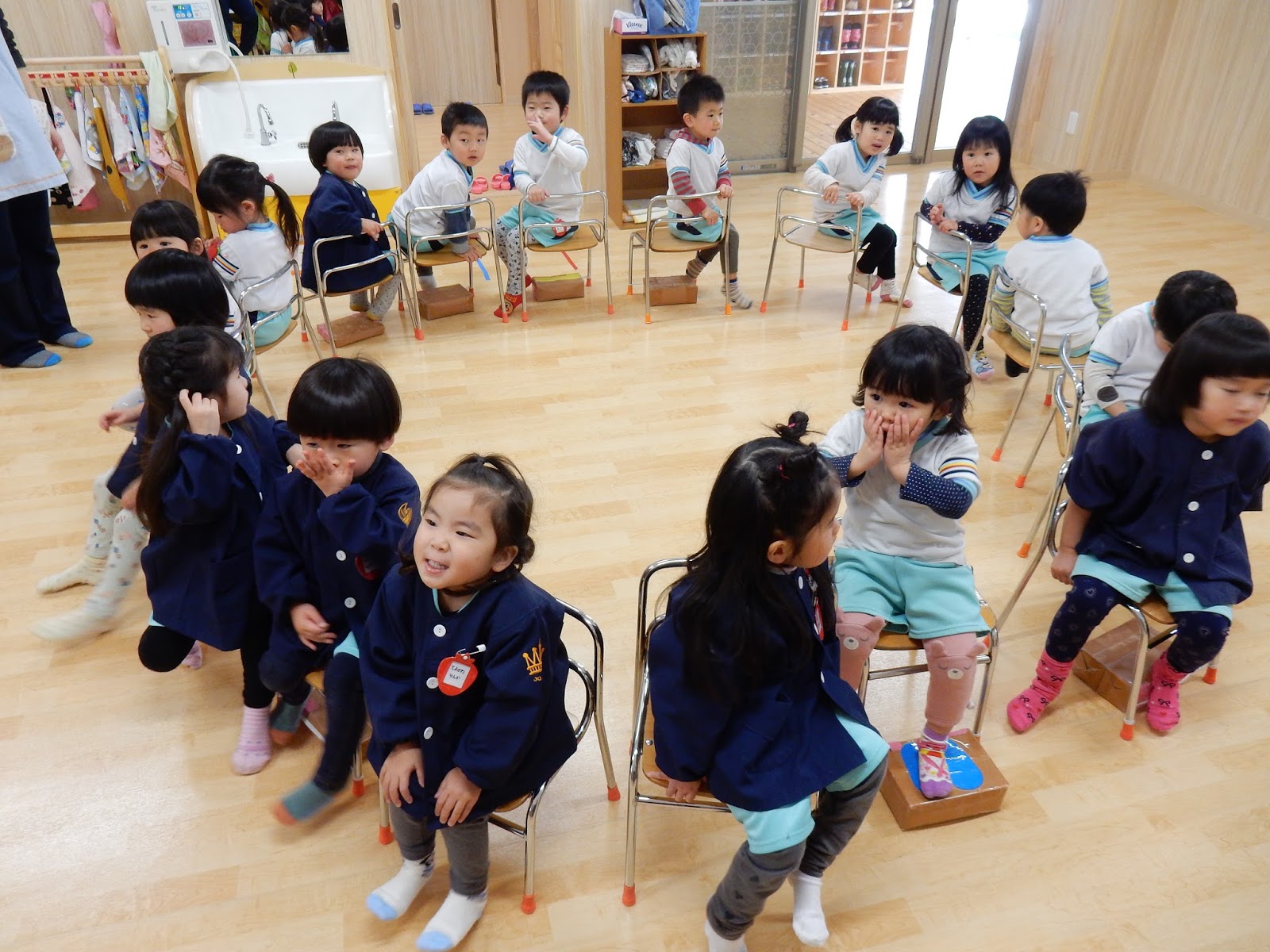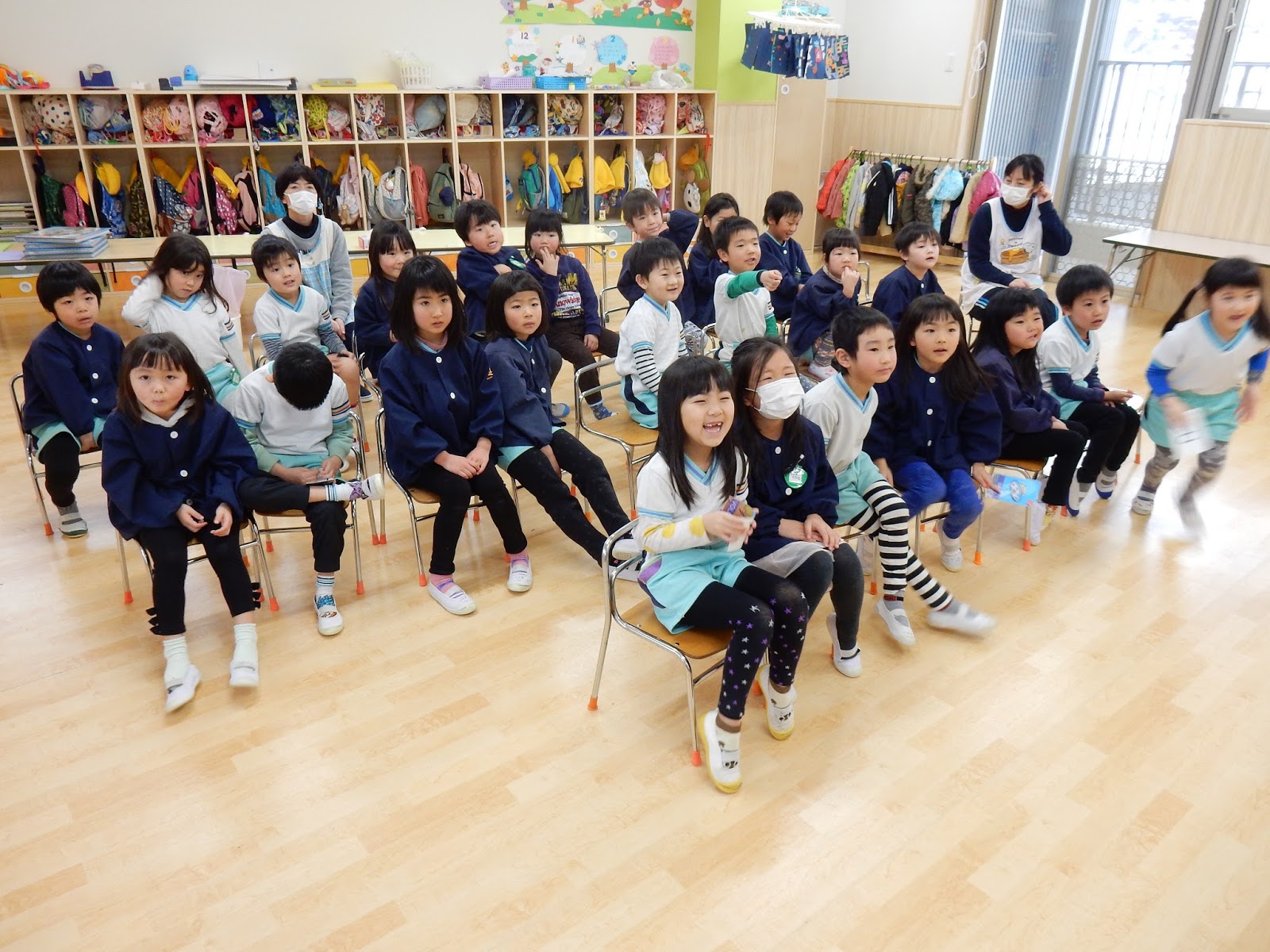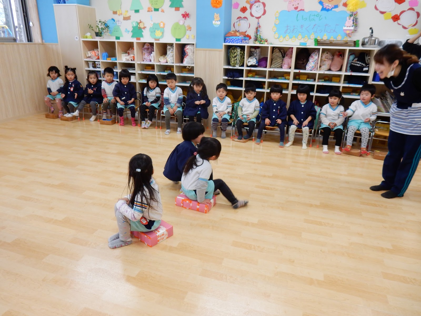 ゆりさんからは、“かごめかごめ”が聞こえてきました。真ん中の王様を囲んで輪になり、歌を歌いながらみんなで回ります。『後ろの正面、だ~ぁれ??』周りの子からヒントをもらって、後ろに座った子を当てます。バスで来る子かな?男の子?女の子??と聞いていくと、みんなよくわかるんですね!大正解!!!お友達に当ててもらえると嬉しいですね♪