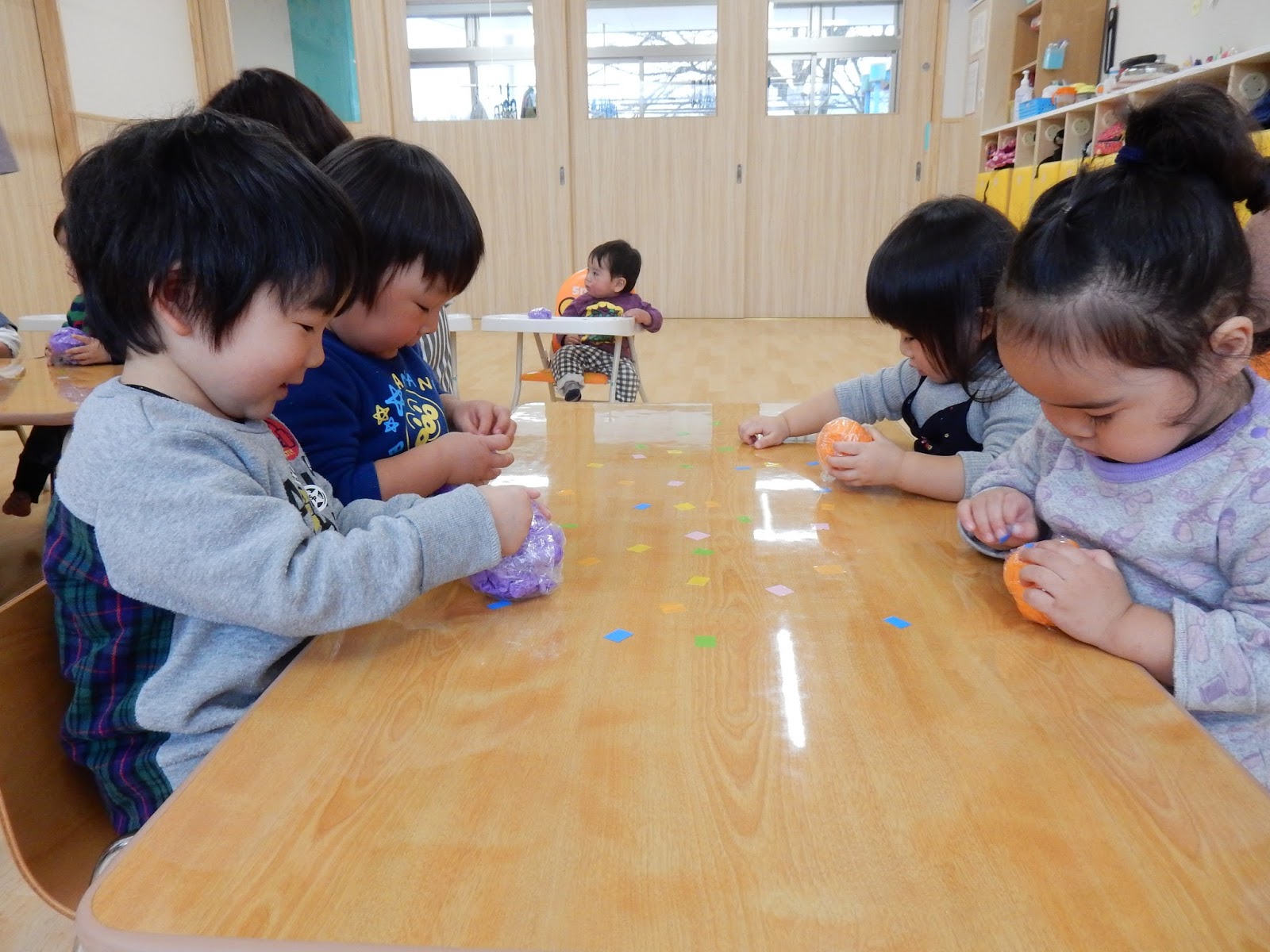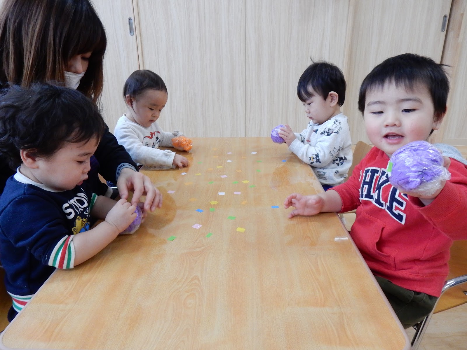 ひよこさんは、お店屋さんの準備でアイスクリームにチョコスプレーをトッピング♪机に貼ってもらったビニールシールを器用にはがして、アイスに貼っていきます。1歳児さんが制作しているあいだ、0歳児さんは...モグモグ(笑)思わずアイスを口に入れちゃう姿も♡