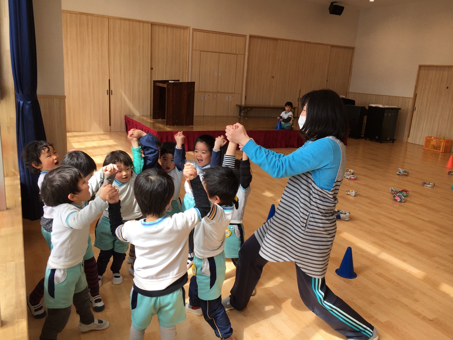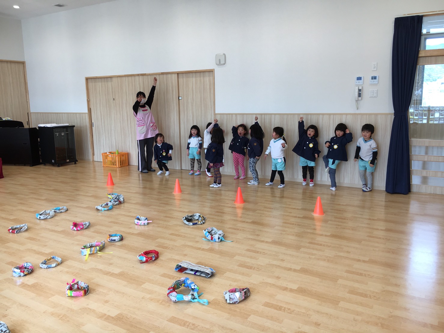出来あがったマーリングで、だるまさんが転んだをしたり、男の子と女の子対抗で取り合いっこゲームをしたりとホールで大盛り上がり!体を動かして、頭も使って、楽しく遊ぶ事が出来ましたよ!