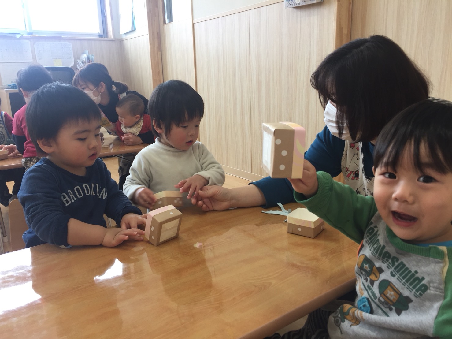 ひよこさんは、大好きなシール貼りをしています。ペタペタと小箱に貼って行って、これは何ができるのかな??秘密ですが…♡ひまわりさんの卒園のプレゼントを作っているんです!みんなが楽しく貼ったかわいい箱、ひまわり組のお兄ちゃん、お姉ちゃんの喜ぶ顔が浮かびますね♪